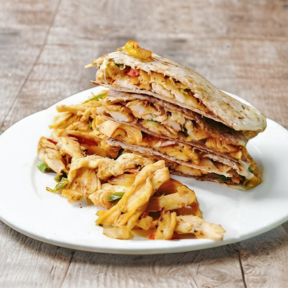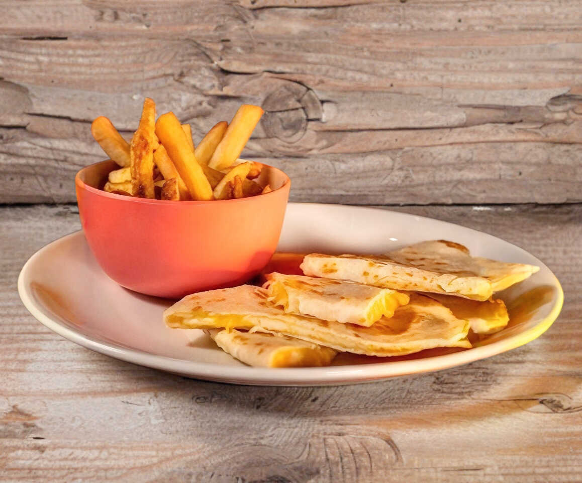 Ricas quesadillas de pollo hechas a base de tortilla de harina fresca sobre un baño de mantequilla; con queso oaxaca derretido y acompañadas de las mejores papas a la francesa.