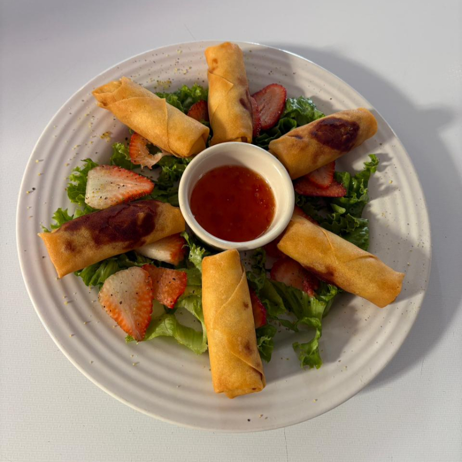 Media docena de masas rellenas de carne y verduras, acompañadas de salsa de soya