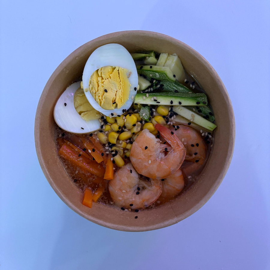 Fideos caldosos acompañados de camaron, huevo cocido y verduras