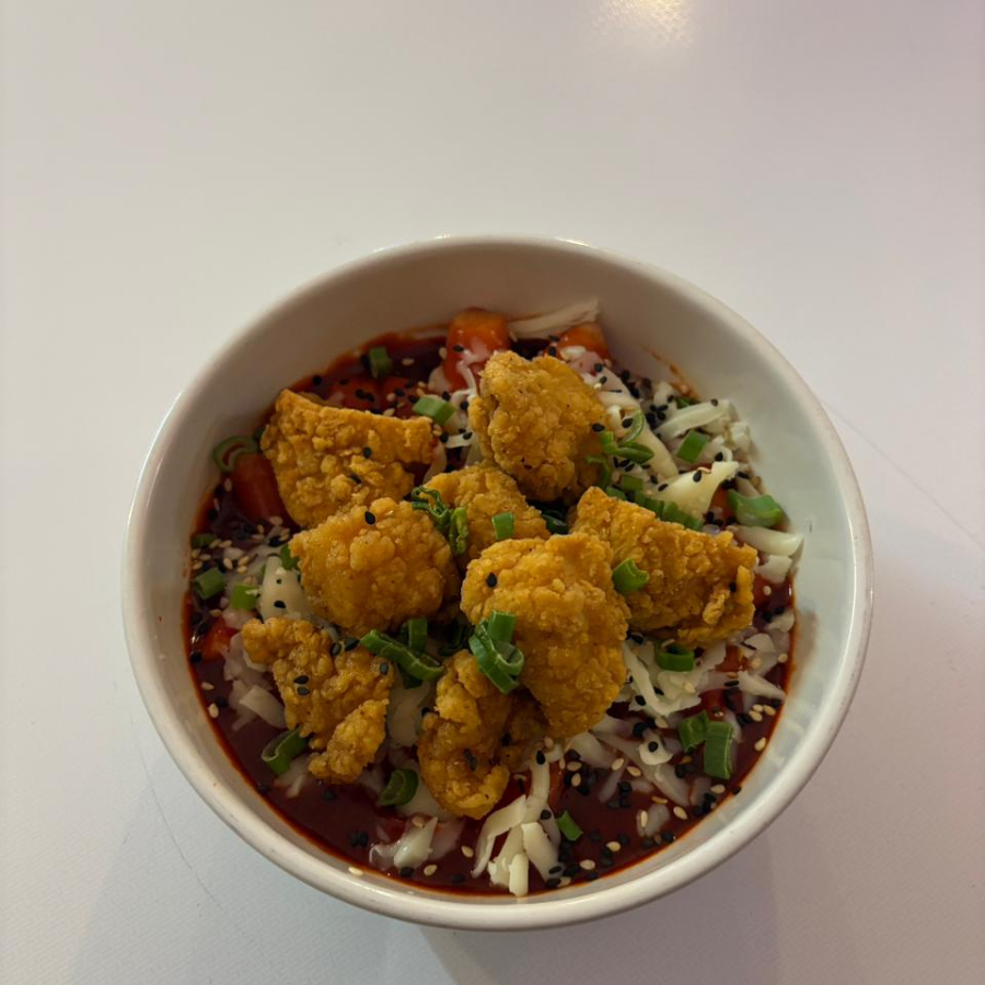 Pastel de arroz bañado en salsa gochujang dulce acompañado de pollo frito y queso