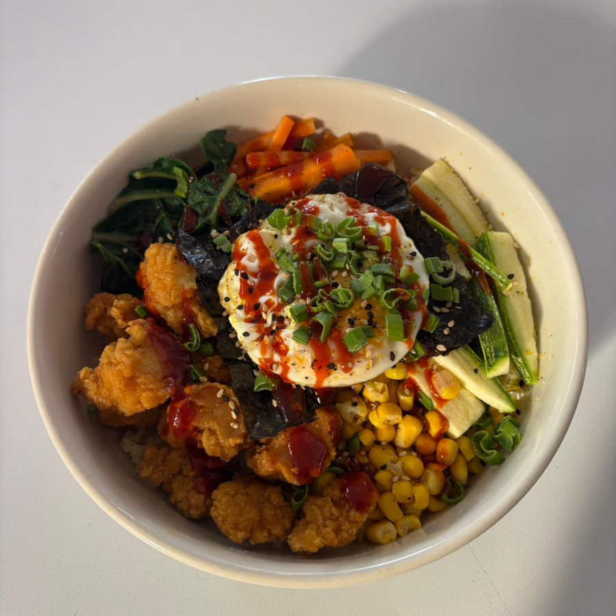 Arroz blanco con calabaza, zanahoria, alga y germen de trigo y alfalfa: acompañado de pollo frito, huevo estrellado, cebollín y sésamo