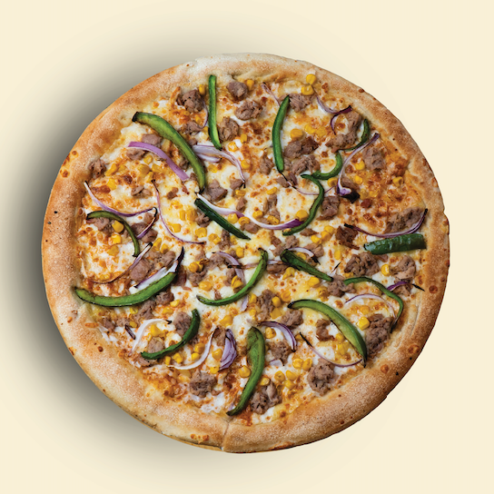 Pizza grande 35 cm. Base de aderezo chipotle, queso, atún, elote, pimiento verde y cebolla morada.