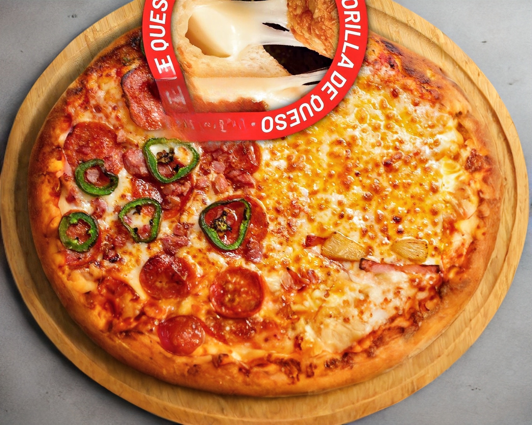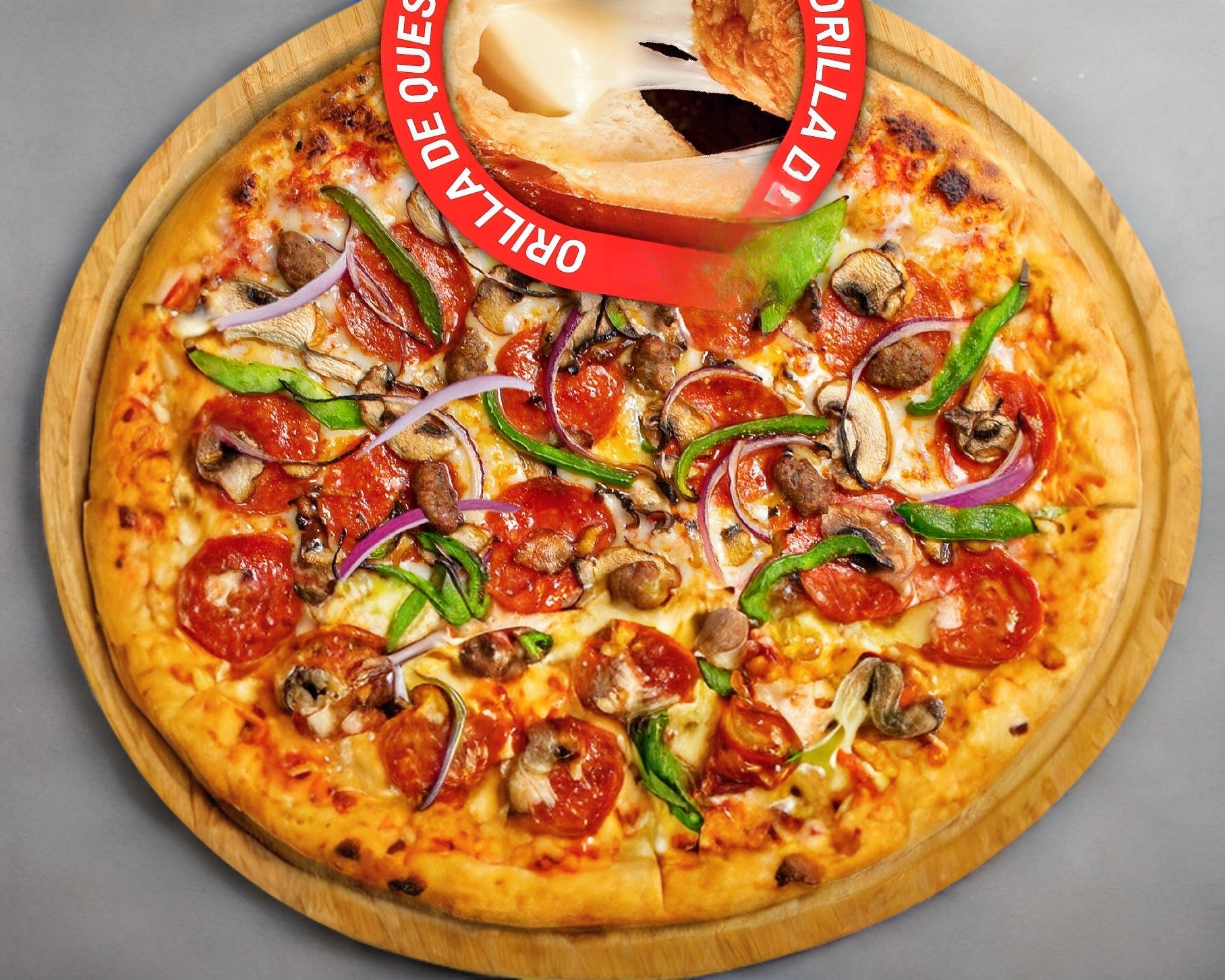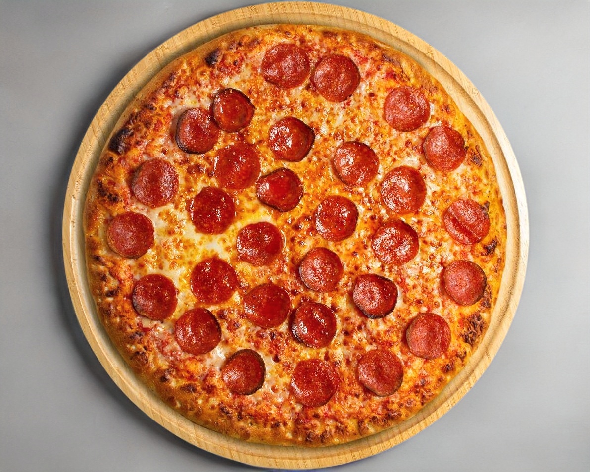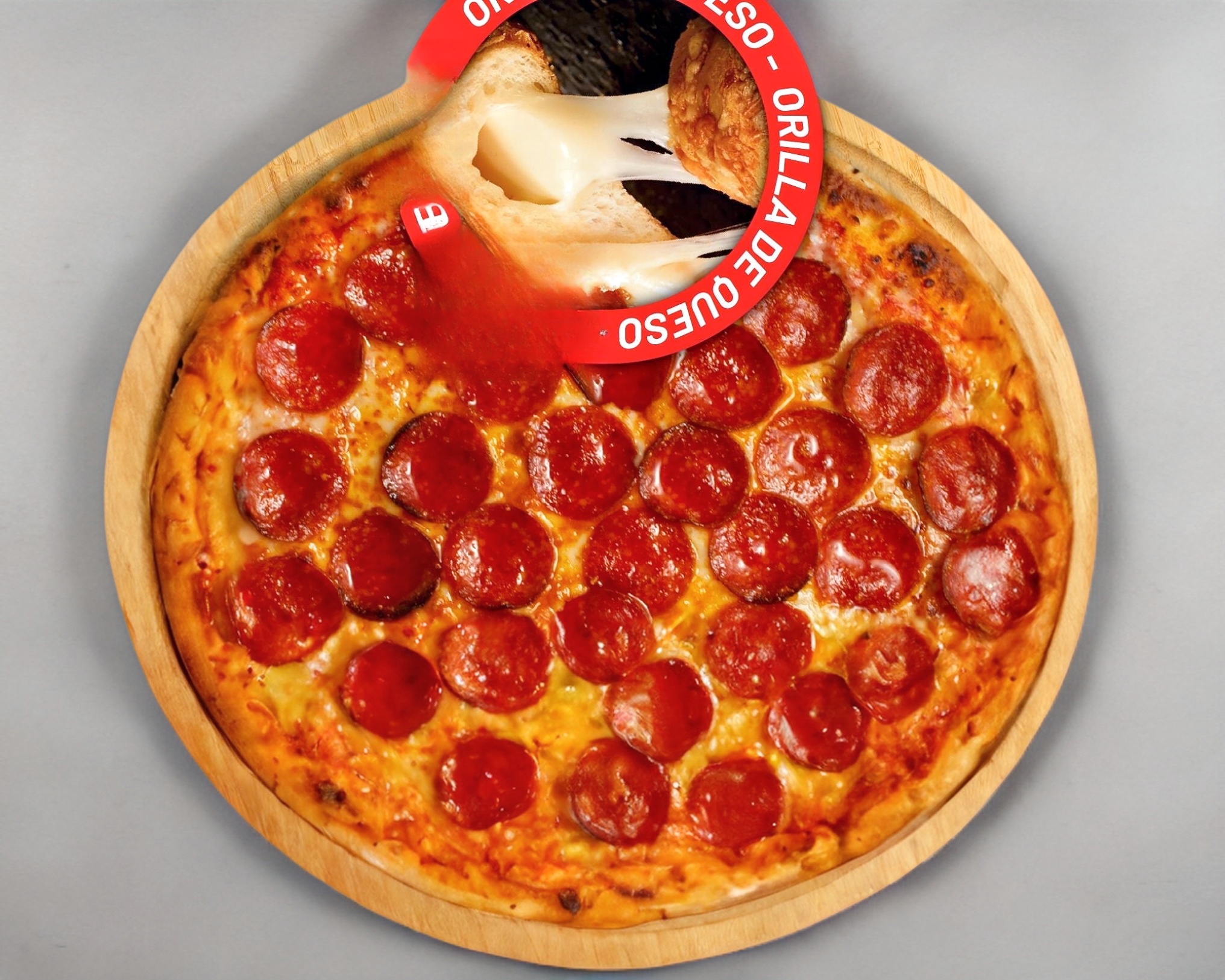 Pizza 8 rebanadas con masa de harina, salsa de tomate, mezcla de quesos KILLER, Pepperoni, con EXTRA QUESO Y EXTRA PEPPERONI.