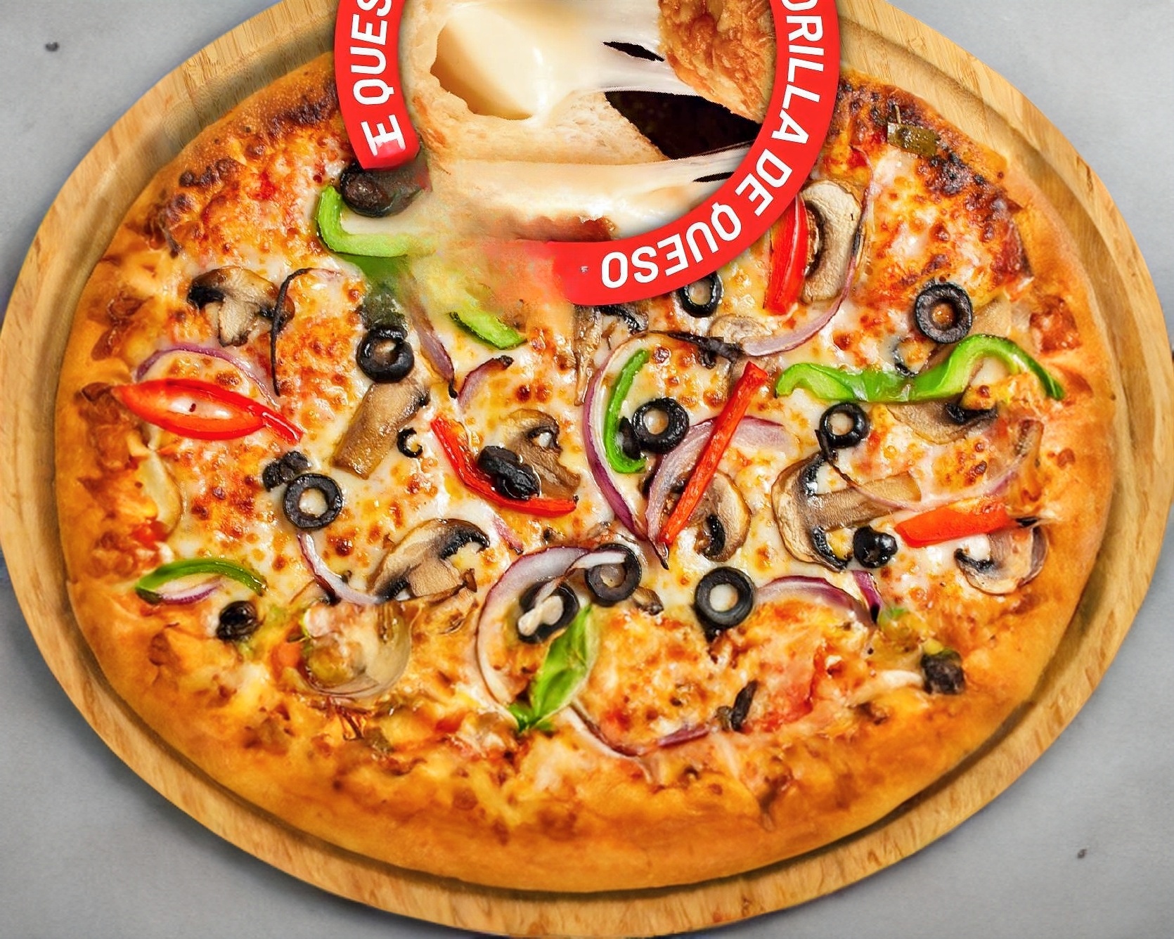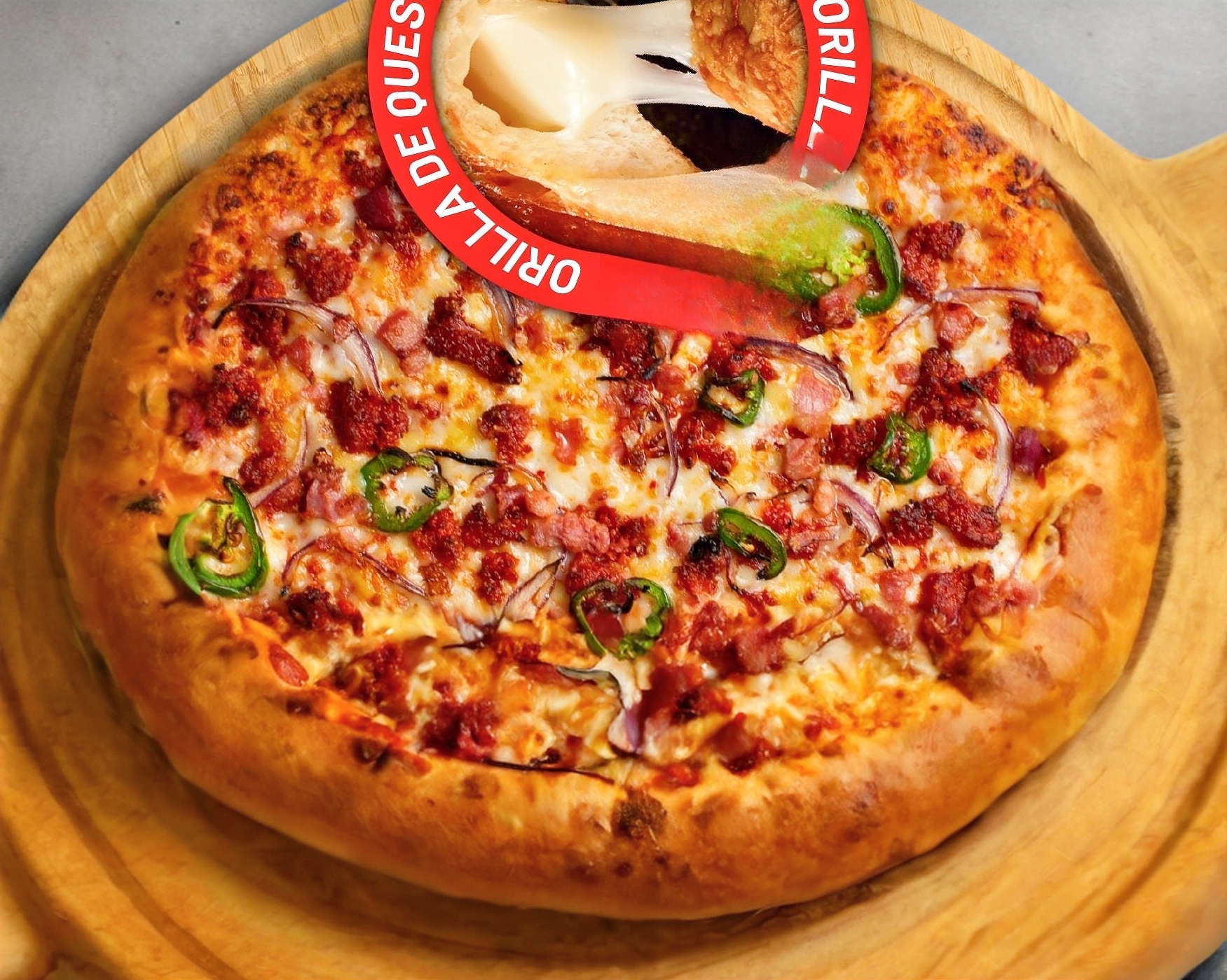 8 rebanadas masa harina, salsa tomate, mezcla de quesos KILLER, chorizo, tocino, pimiento verde cebolla morada, chile serrano
