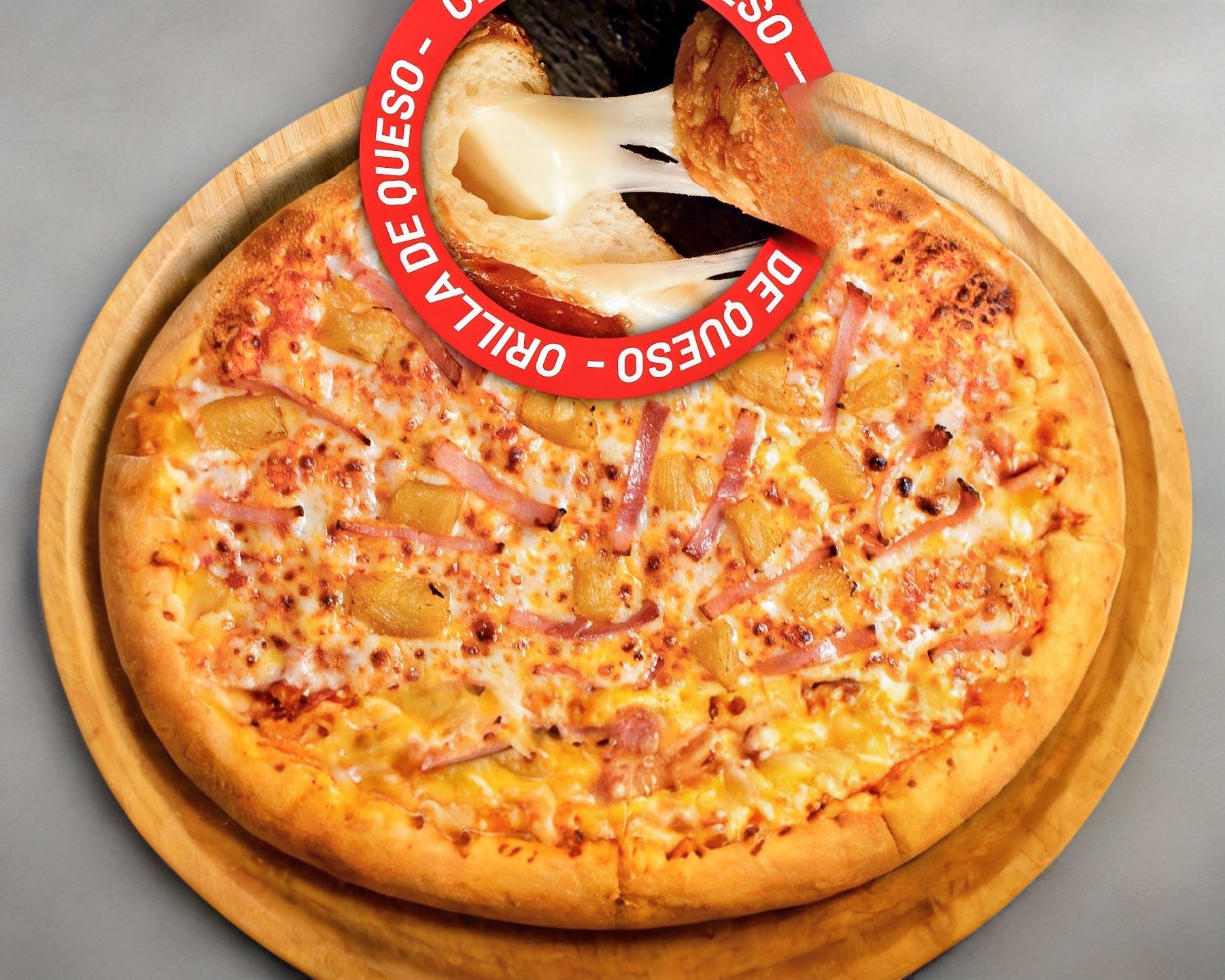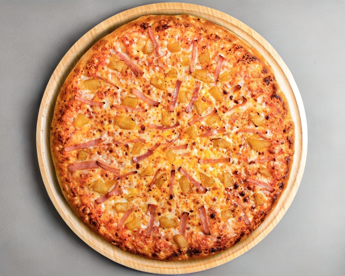 Pizza 8 rebanadas con masa de harina, salsa de tomate, mezcla de quesos KILLER, piña y jamón.