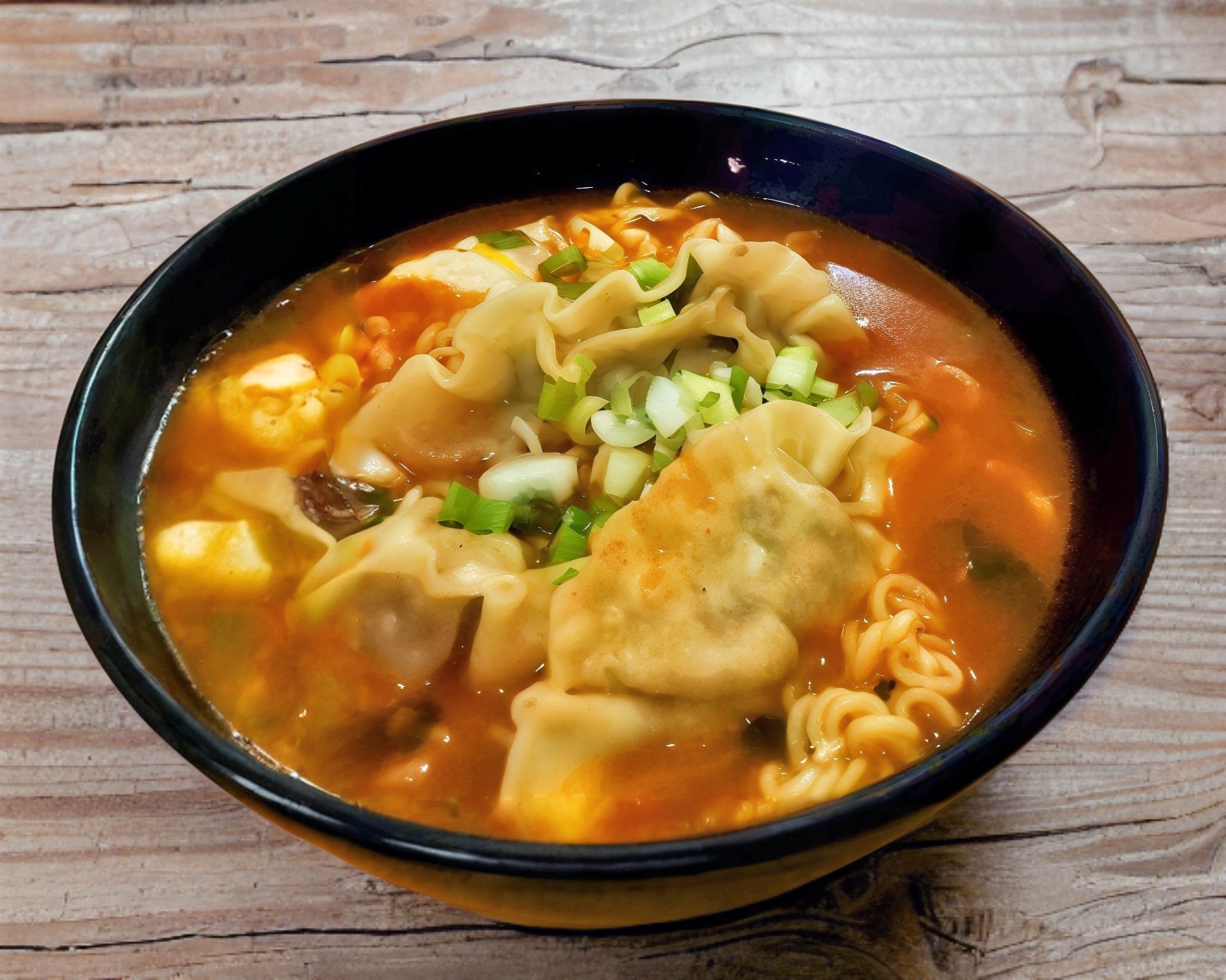 3 Piezas de mandu, huevo revuelto en su sopa y cebollín. incluye fideos de ramen, caldo preparado a base de carne o mariscos.