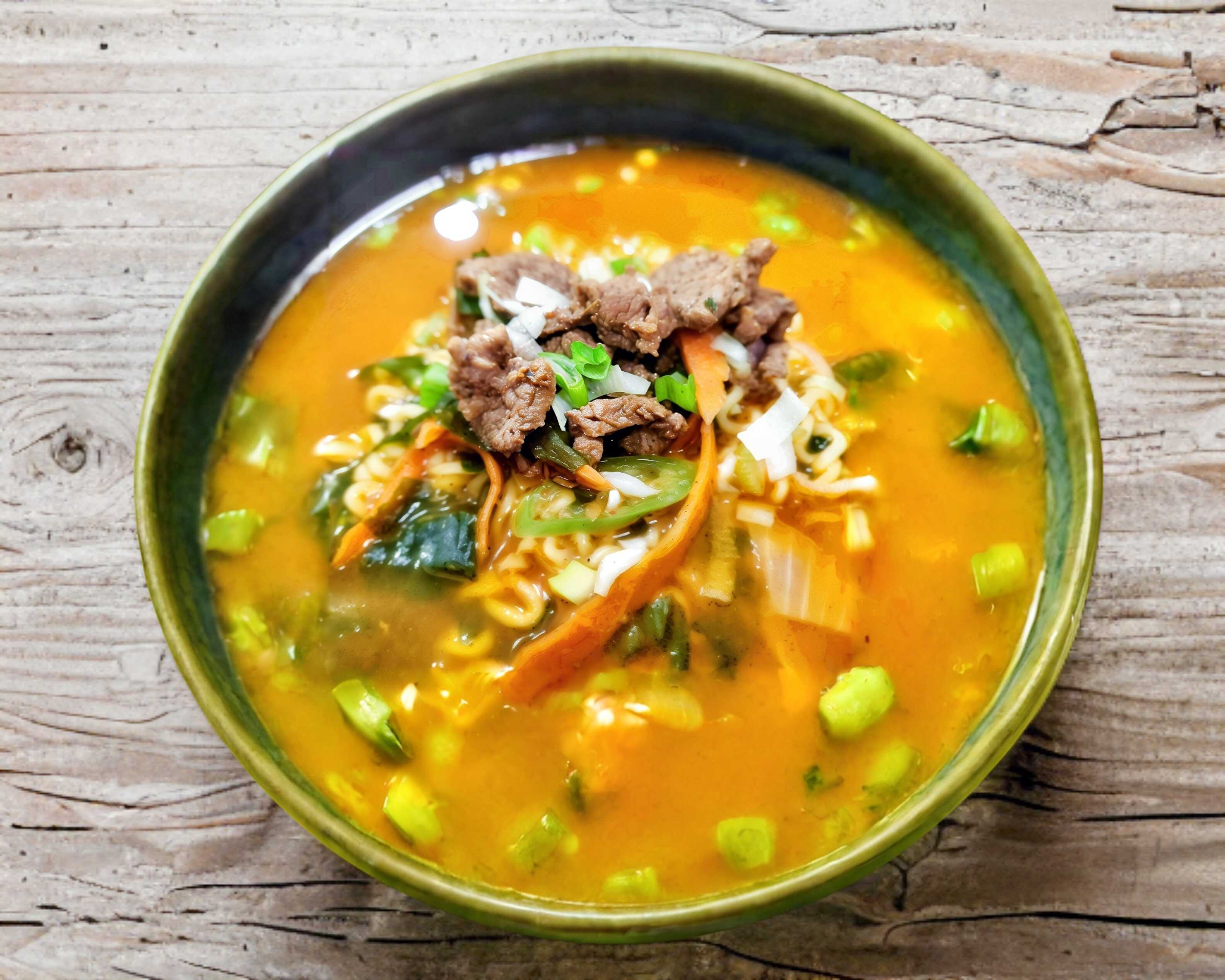 Huevo revielto en su sopa, cebollín y res. Incluye fideos de ramen, caldo preparado a base de carne o mariscos.