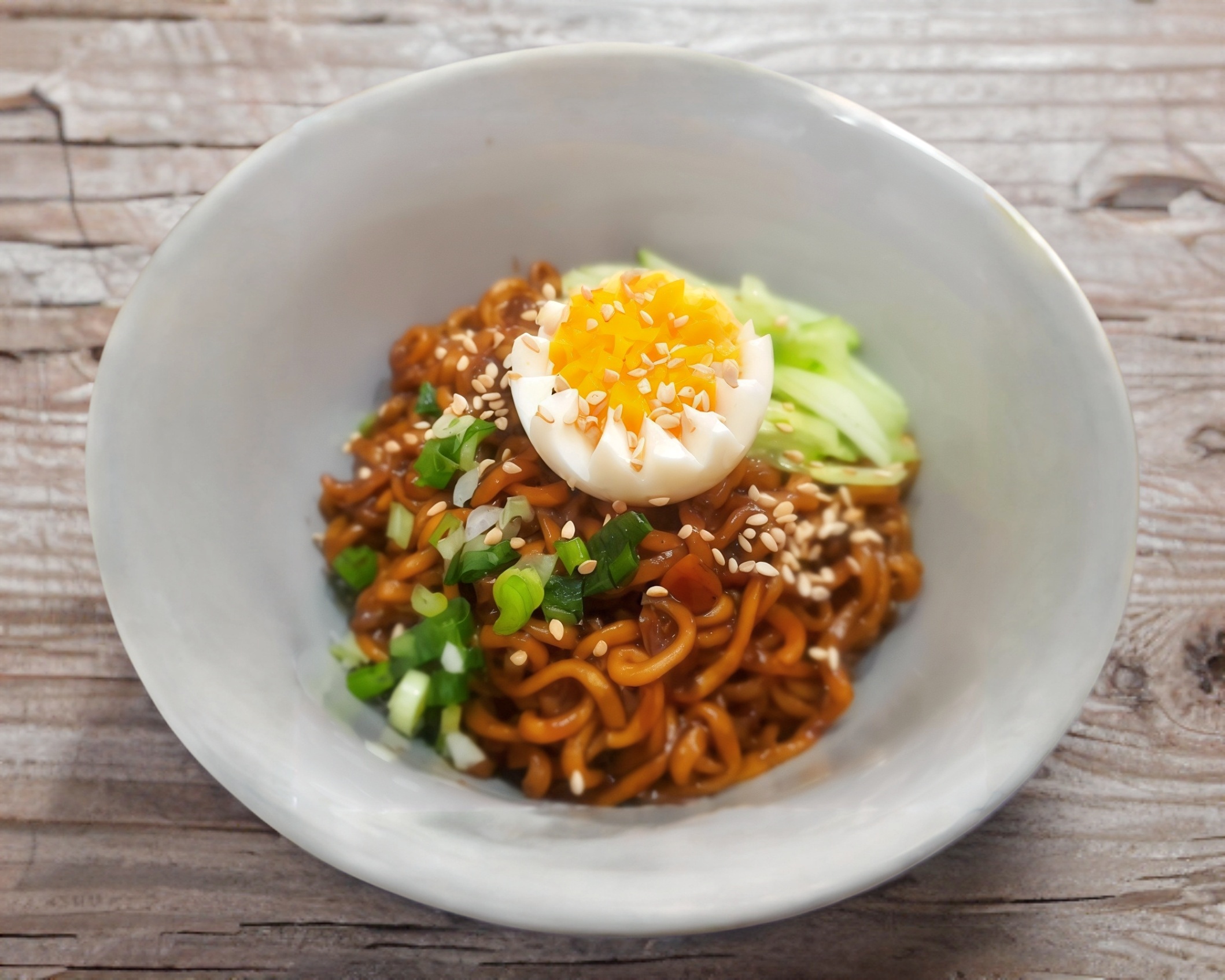 Ramen seco muy picante, huevo cocido, cebollín, pepino. incluye fideos de ramen.