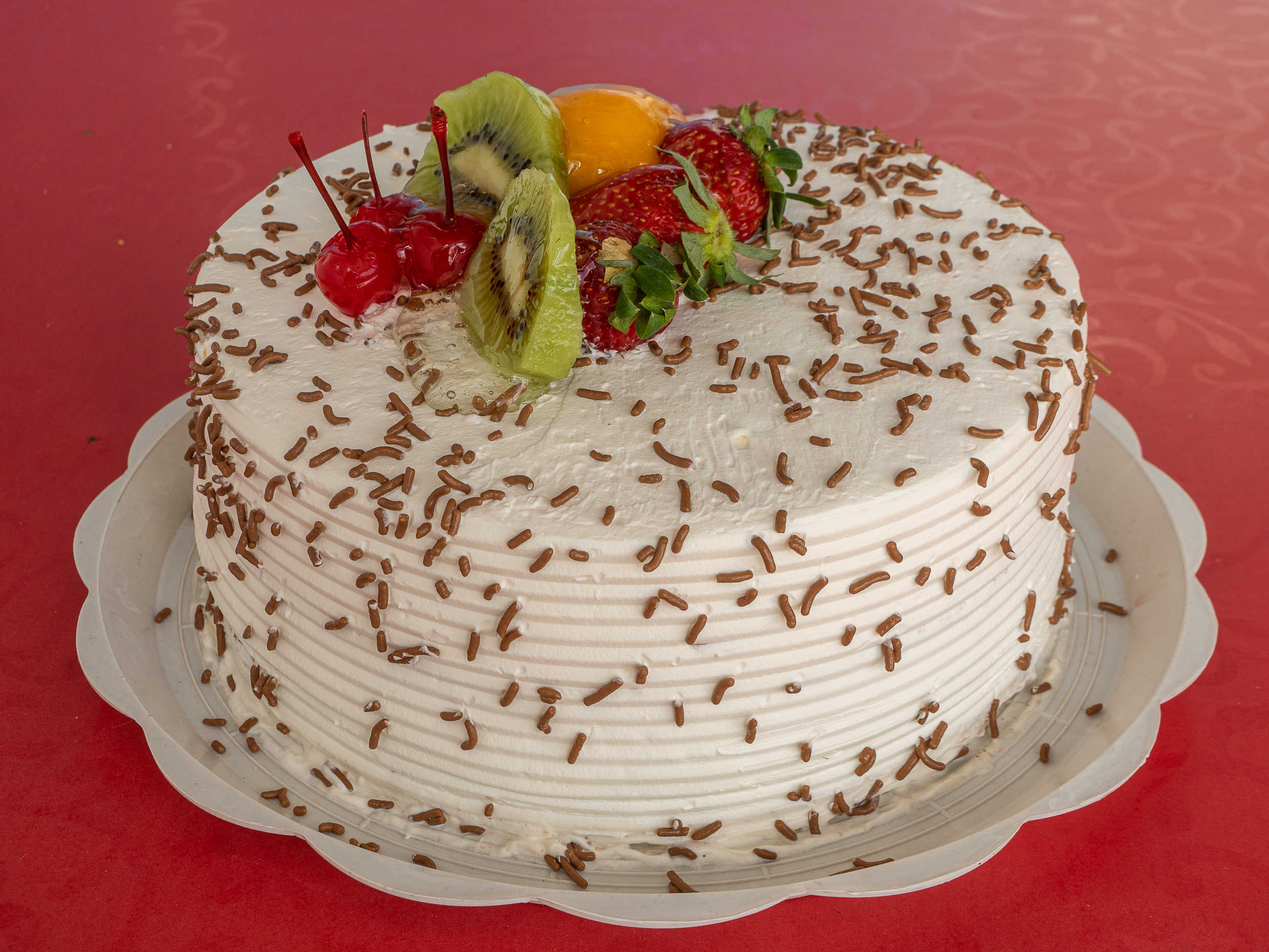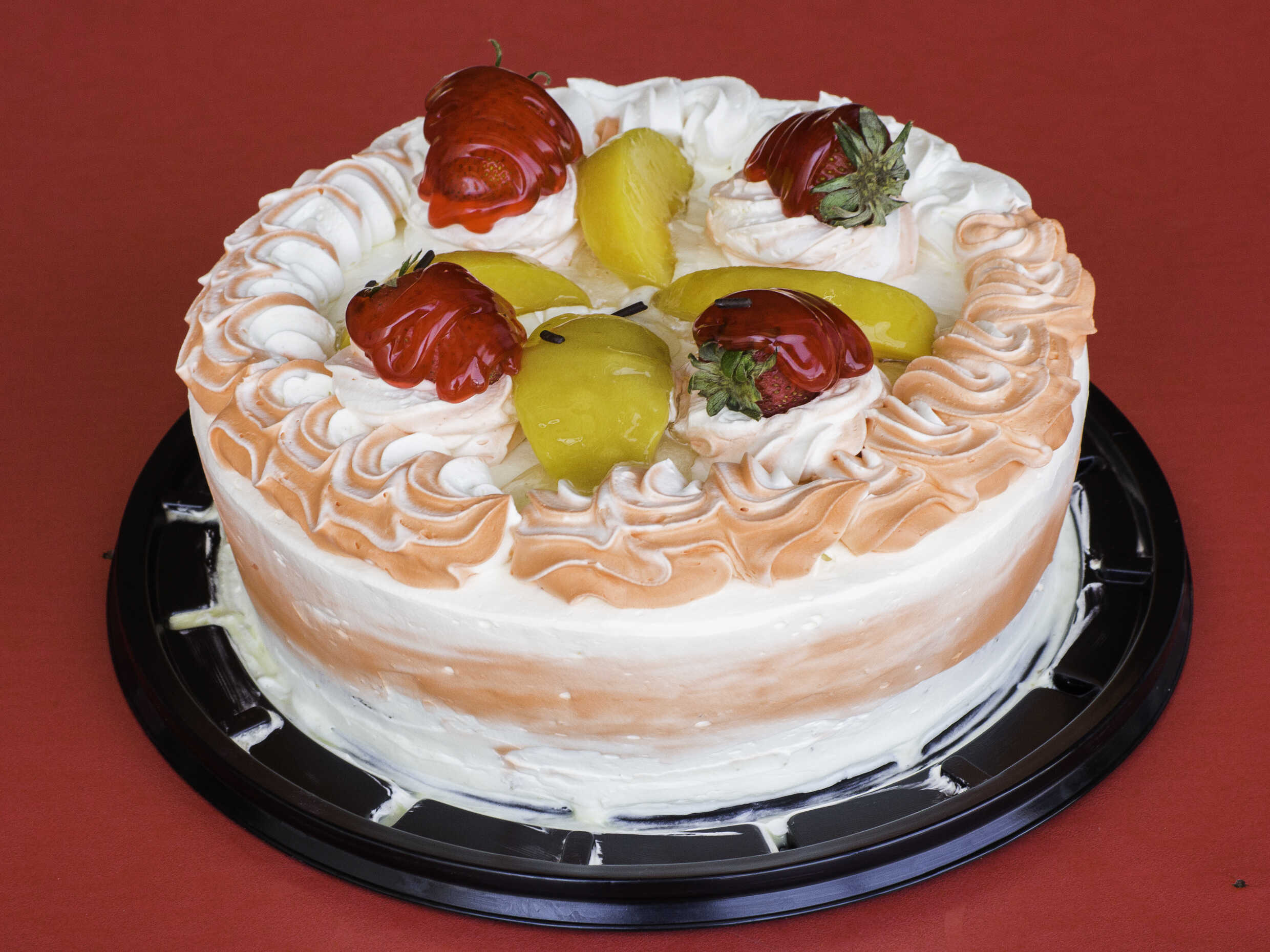 Para 15 porciones, con durazno, uva verde, uva roja, cereza, nuez y piña.