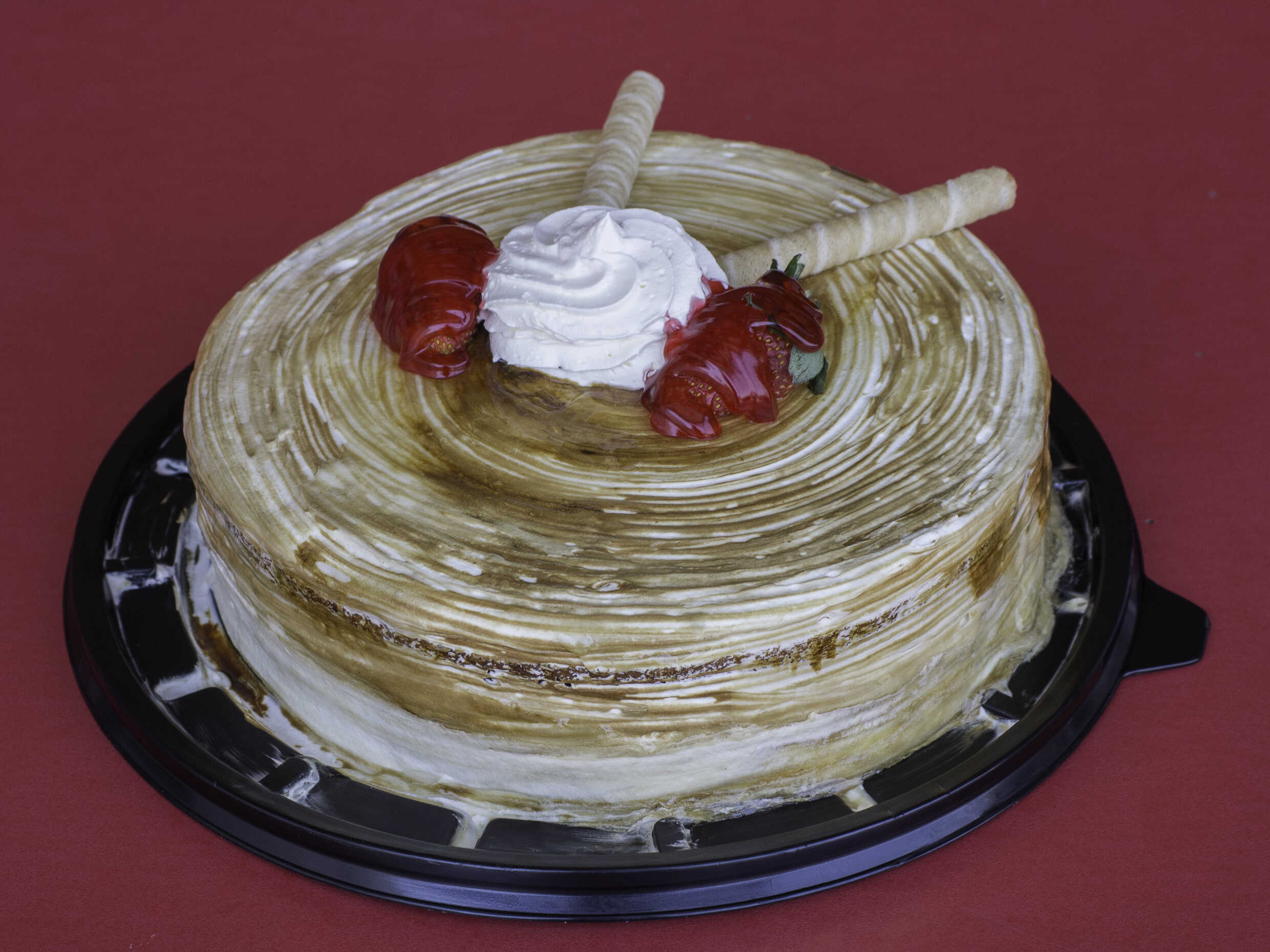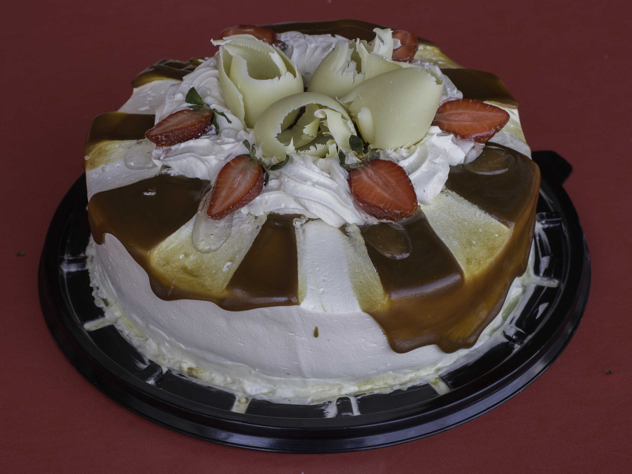 Rebanada de pastel tres leches relleno de durazno con nuez, pan de vainilla