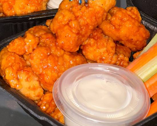 Orden individual de boneless de 250 g, aproximadamente entre 8 a 12 piezas. Bañados en salsa a elección, acompañados de 1 aderezo ranch.