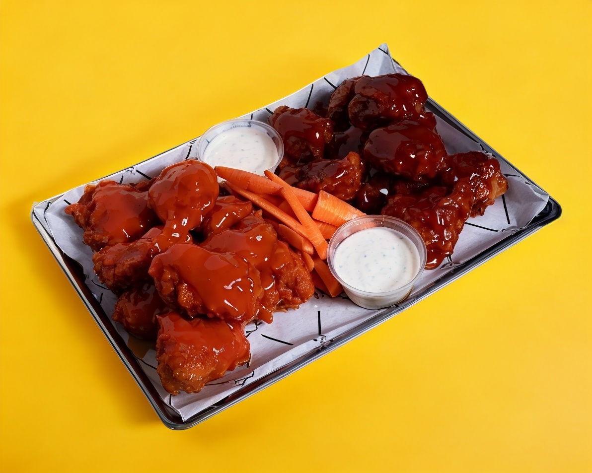 Dos ordenes individuales de 250g bañados en salsa a eleccion, acompañados de 1 aderezo ranch cada uno y una orden de papas a la francesa.