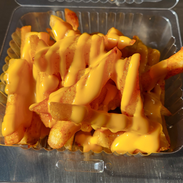 Papas a la francesa sazonados con sal y paprika bañadas con queso americano derretido