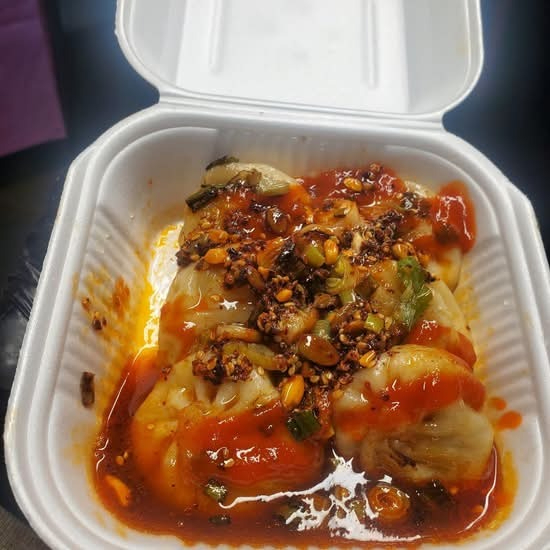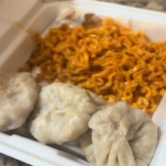 Ramen Maruchan con dumplings, salsa macha, soya y sriracha.