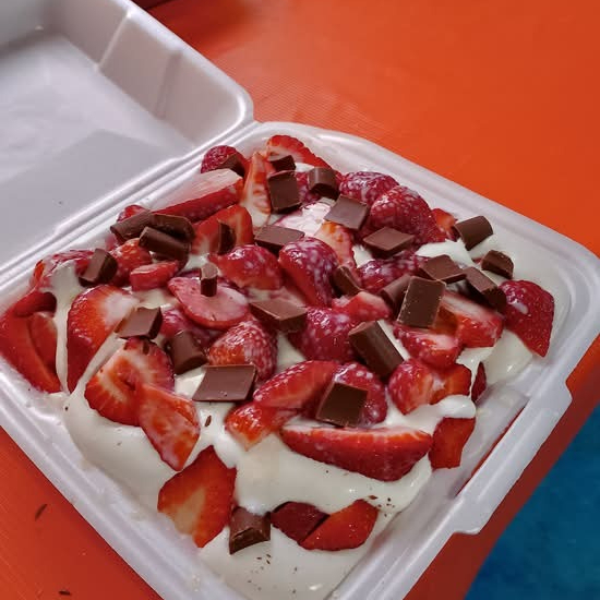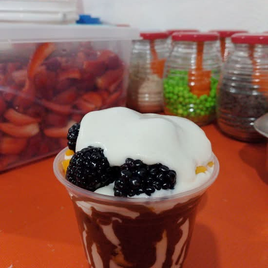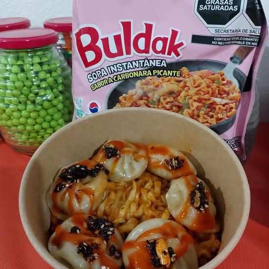 Ramen Buldak carbonara con dumplings, salsa macha, soya y sriracha.