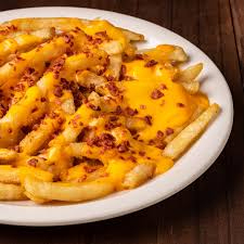 Orden de papas fritas medianas, acompañadas de 2 oz de queso cheddar en contenedor con tapa para que no remoje las papas, y tocino troceado.