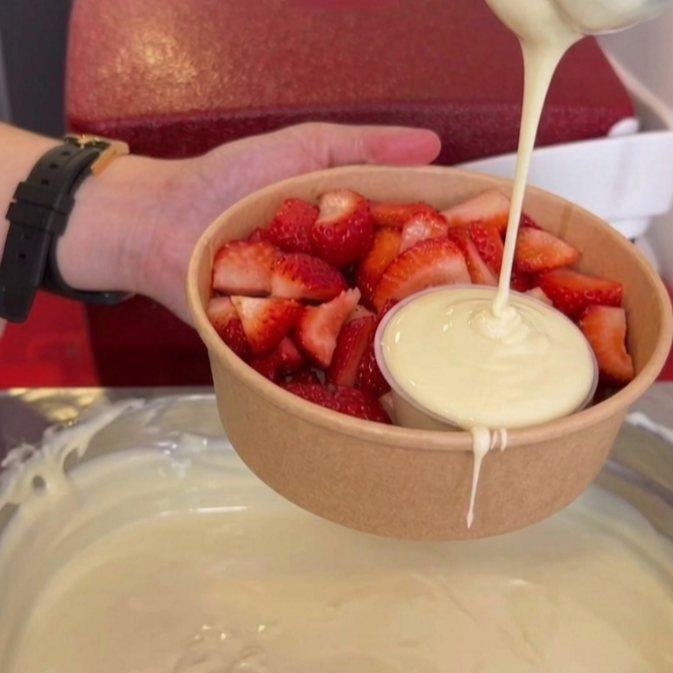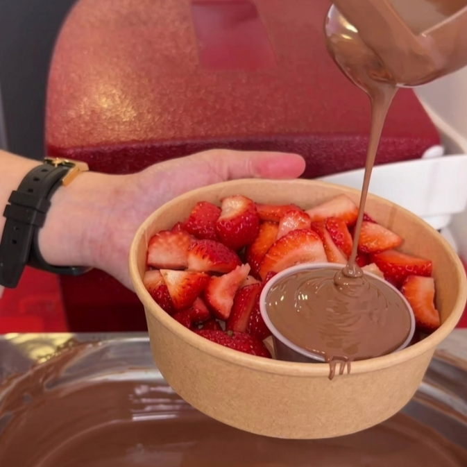 Bowl con fresas enteras y cortadas en mitades, acompañadas de 4 oz de Chocolate de leche
