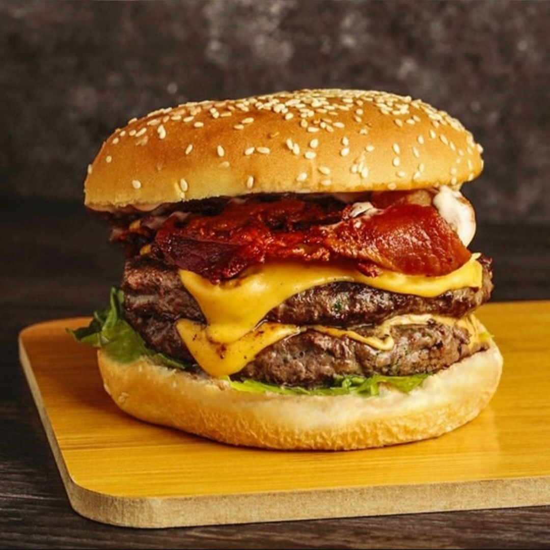 Hamburguesa con doble carne de Sirloin, doble queso americano, tocino, cebolla, jitomate, pepinillos, chiles en vinagre y lechuga.