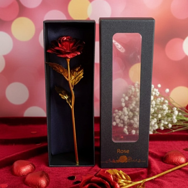Rosa de policarbonato, 24.5cm largo de la rosa, petalos rojos y tallo dorado, dentro de una caja color negro.