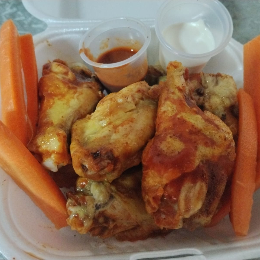6 ALITAS BAÑADAS EN SALSA BBQ, ADEREZO Y ZANAHORIAS