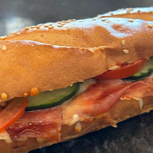 Pan viena natural, aderezo de la casa, queso gouda, jamón serrano, jitomate, pepino, pesto