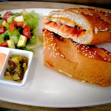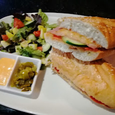 Pan viena natural, atún, aderezo de la casa, queso manchego, jitomate, pepino, pimiento morrón y aceitunas negras, pesto