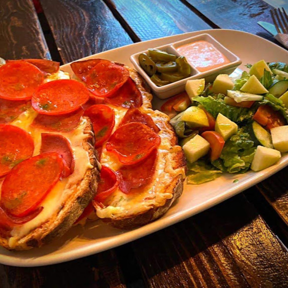 Hogaza de pan rústico, 2 rebanada, preparado con peperoni, salsa italiana y queso gouda