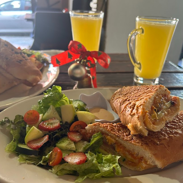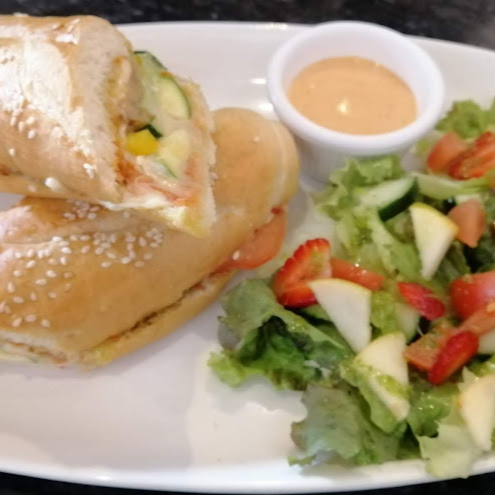 Pan viena natural, aderezo de la casa, jitomate, pepino, queso gouda, calabacitas, pimientos, champiñones, aceitunas negras, pesto