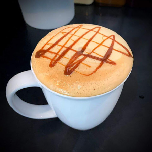 Café con leche espumada, vainilla y caramelo