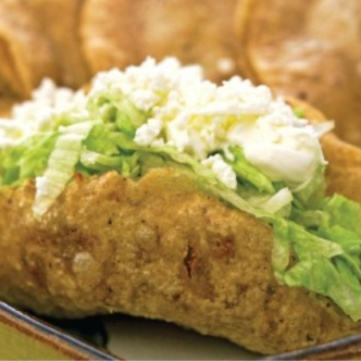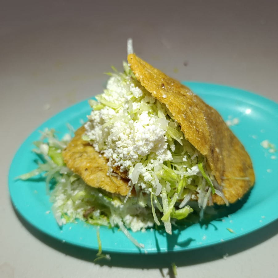 TORTILLA DE MAIZ CON QUESO OAXACA Y PICADILLO, UNA VEZ FRITA SE ABRE Y SE PONE LECHUGA Y QUESO RANCHERO