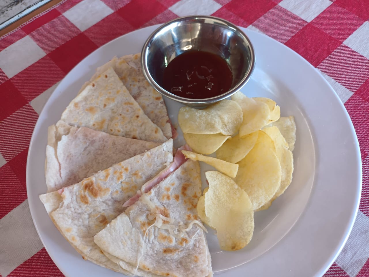Jamón y queso, acompañado de papitas. Incluye yogurt y jugo.