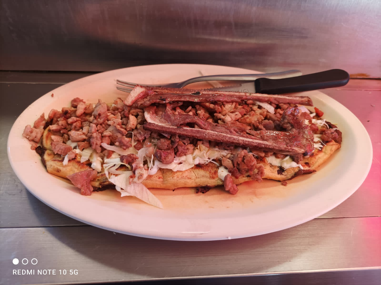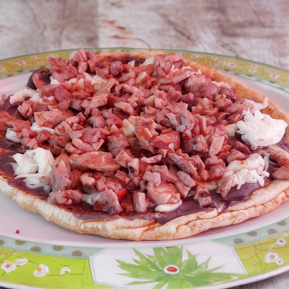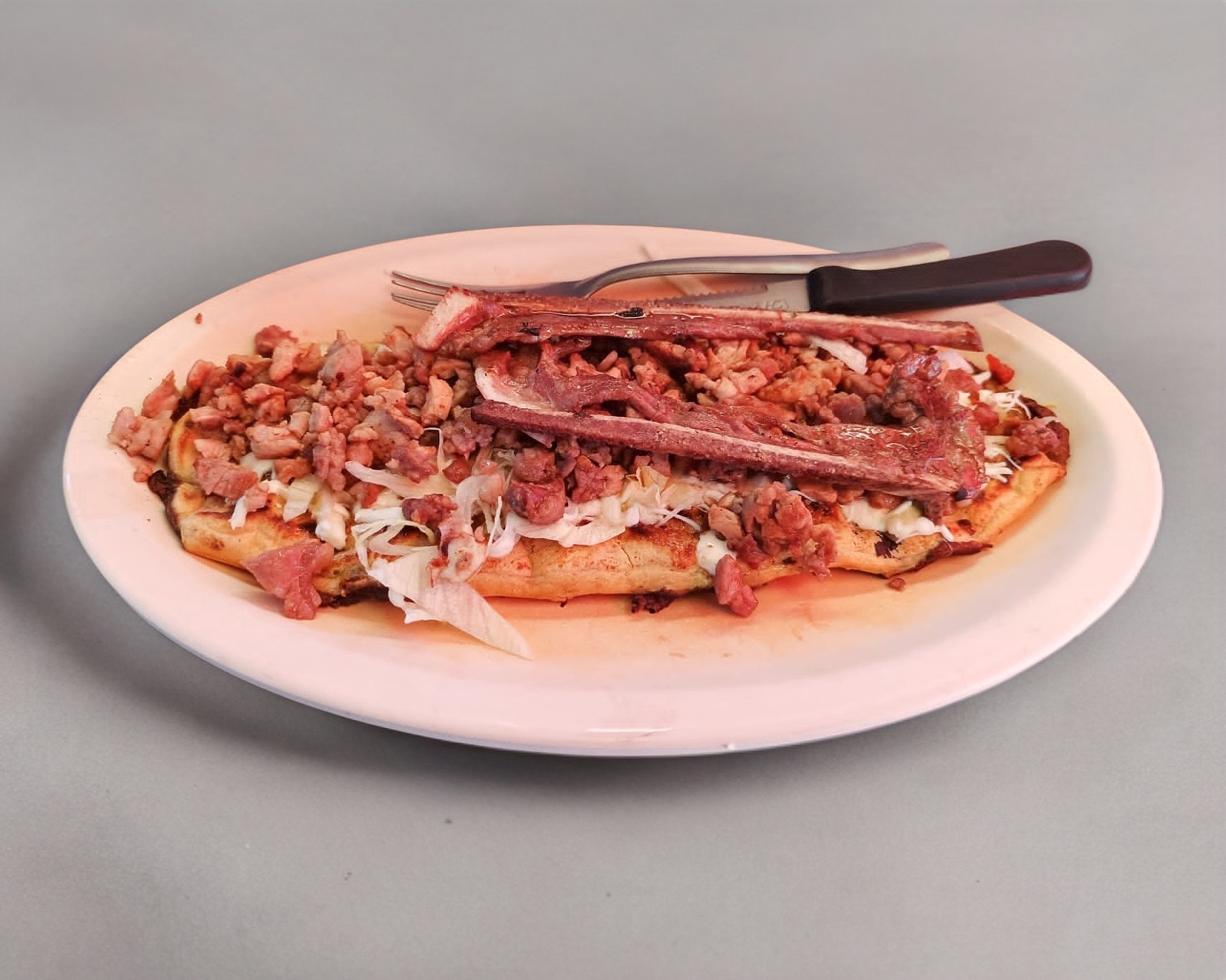 Chuleta, pastor, tocino, morrón, chorizo, cebolla y queso.