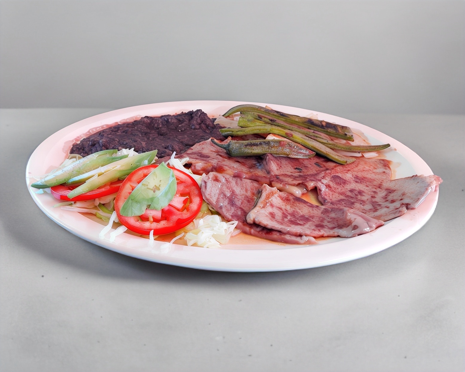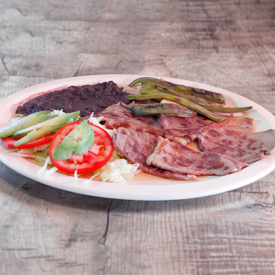 Para 2 personas. Bistec, pastor, costilla, chuleta, chorizo, champiñones, morrón, cebolla, piña, jitomate, aguacate, nopales, chile asado y queso.