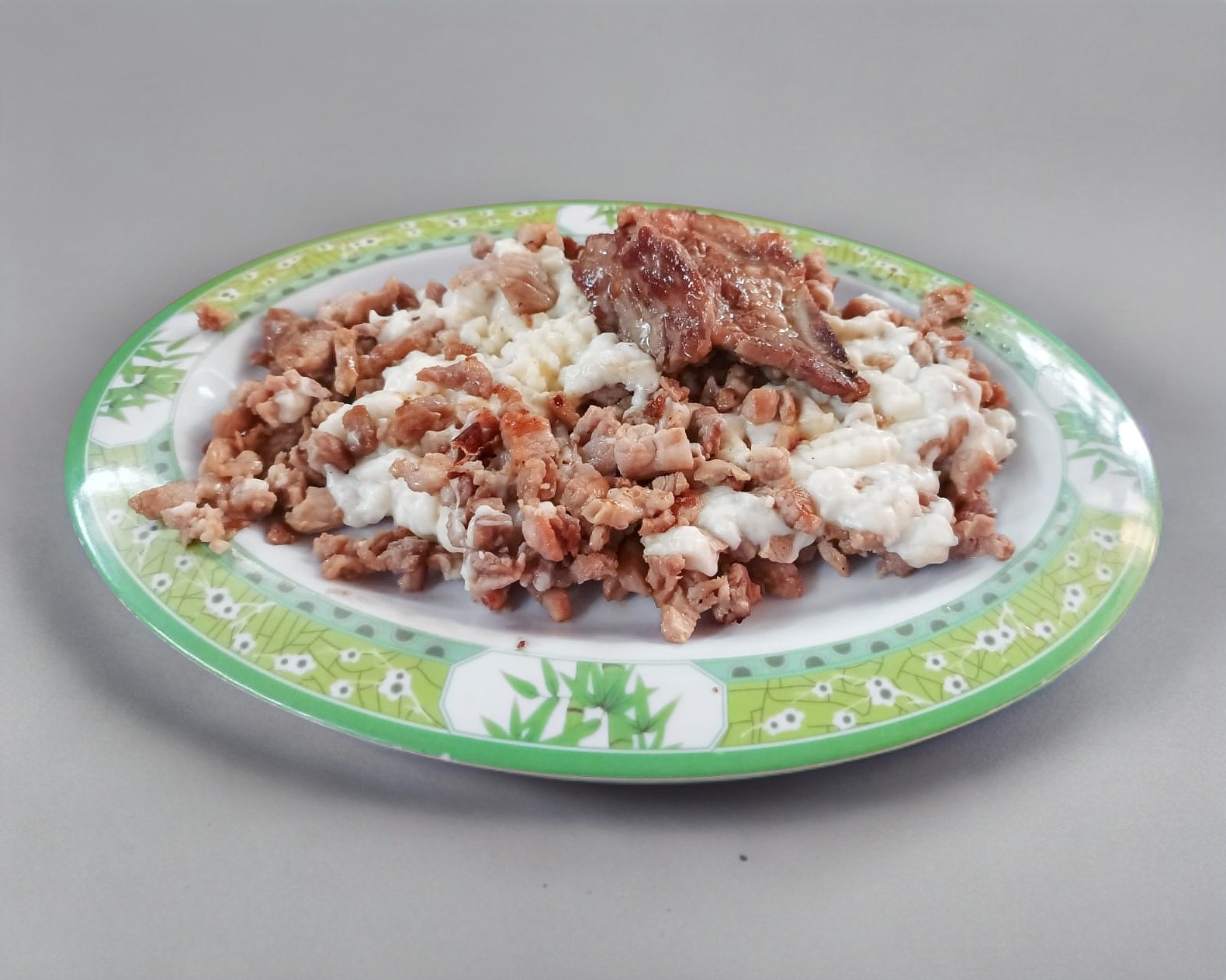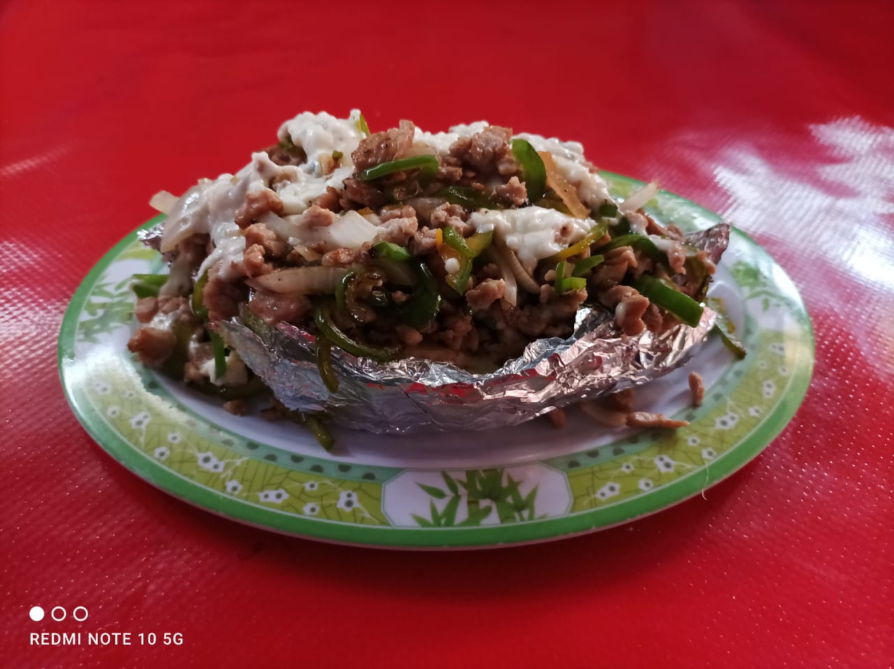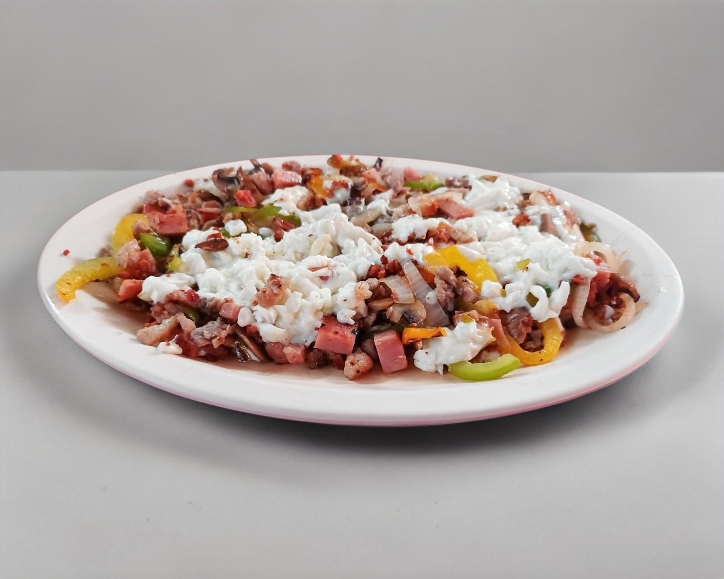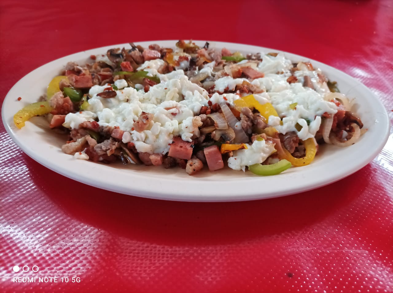 Carne revuelta con chicharron de queso. Tocino, pastor, bistec, costilla, chuleta, piña, morrón. champiñones y envuelto de queso.
