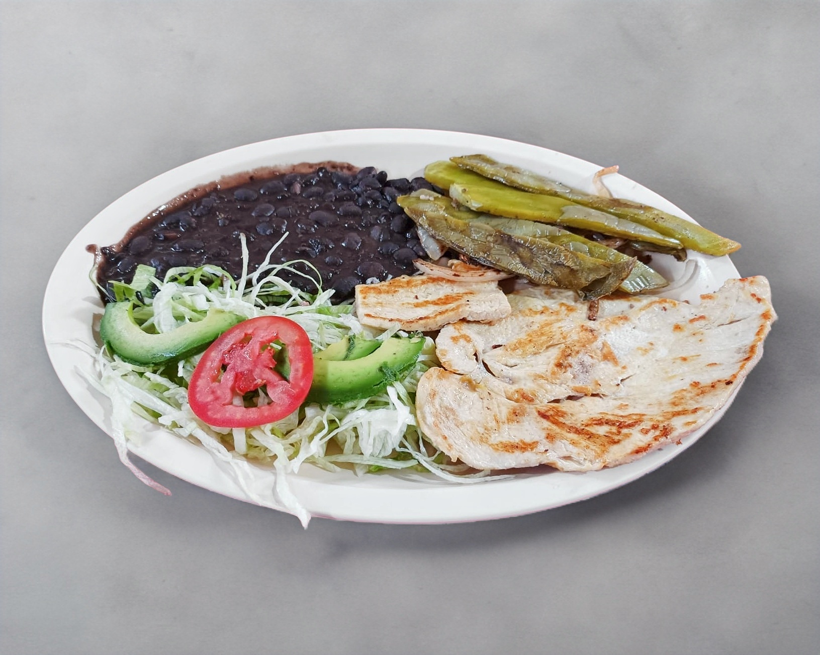 Frijol, ensalada, nopales, cebolla y chiles asados.