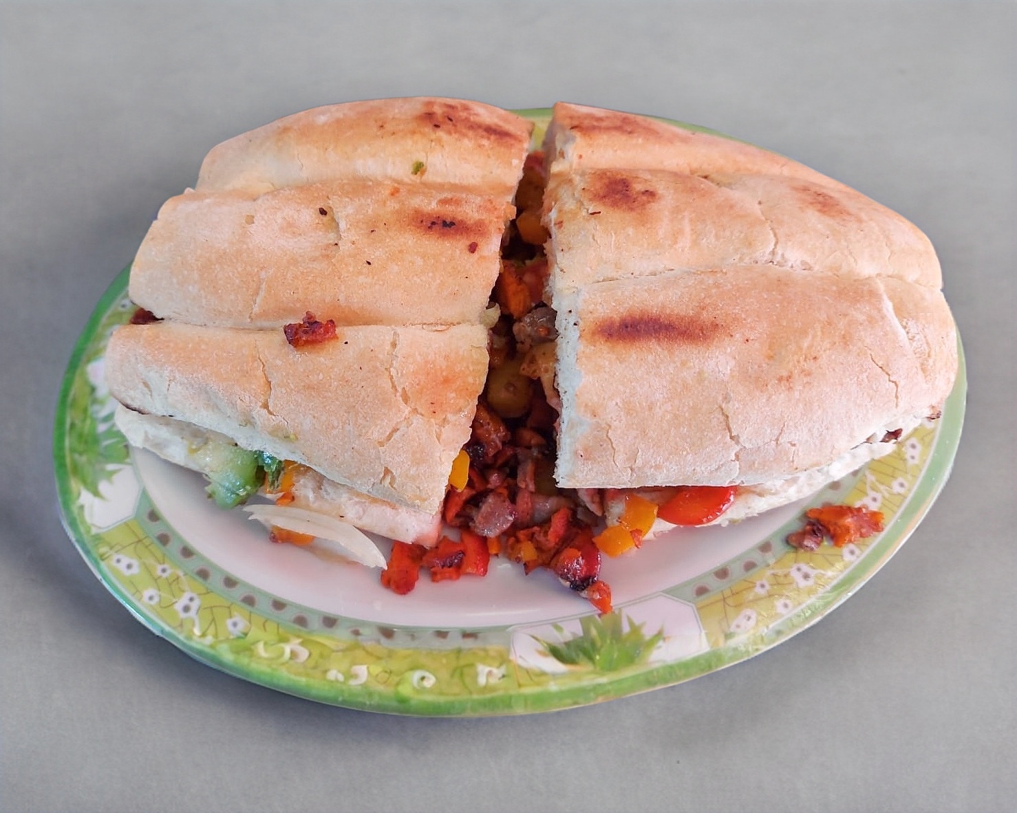 Costilla, chuleta, morrón, cebolla y queso.
