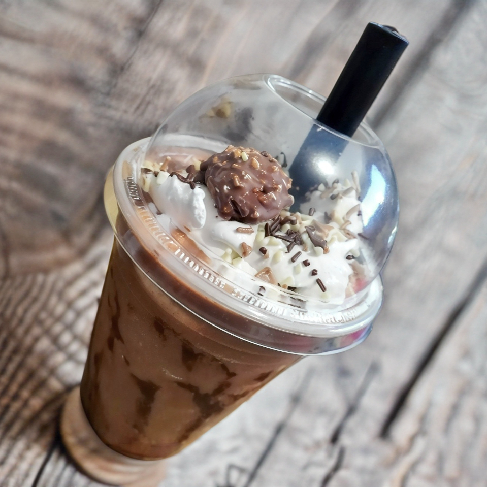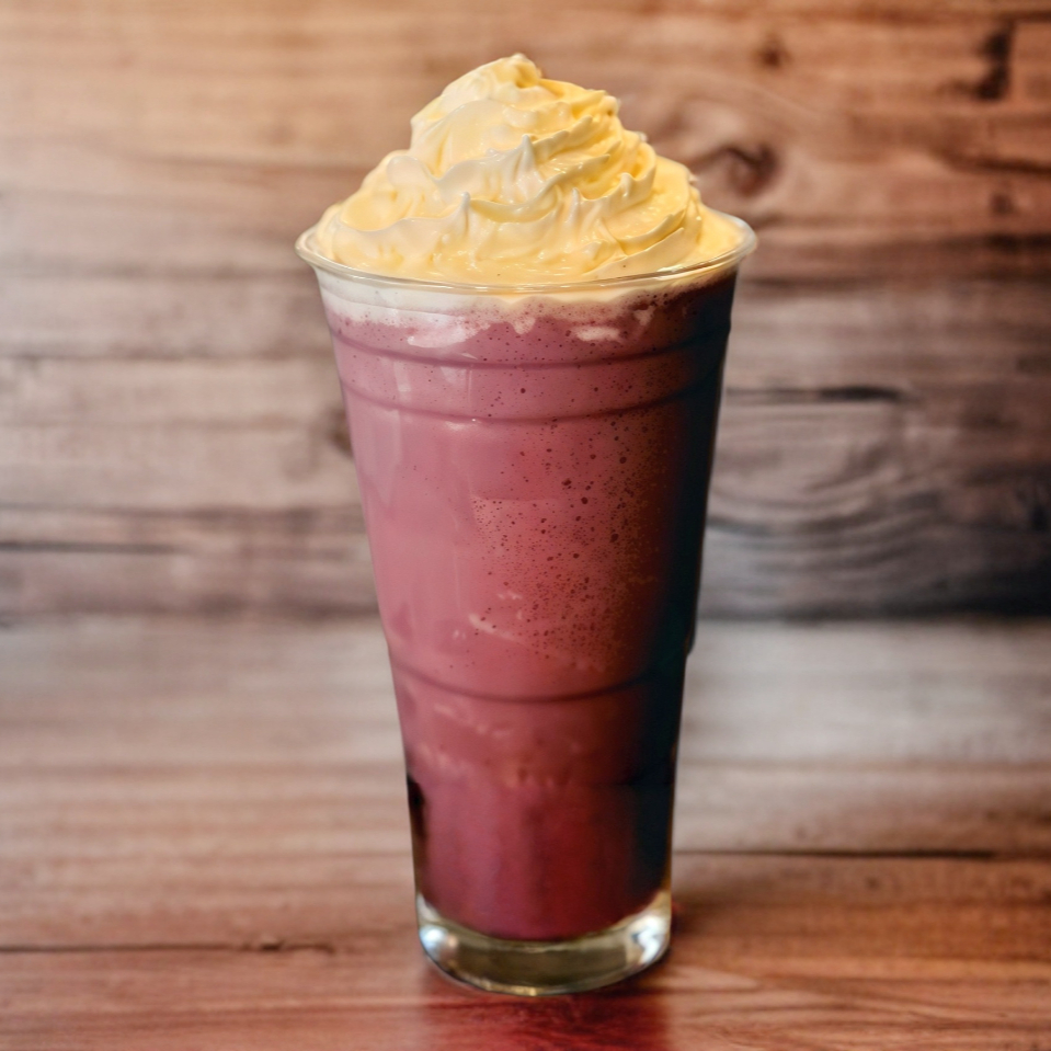 Delicioso frappe de taro con chispas de chocolate , chocolate liquido y crema batida
