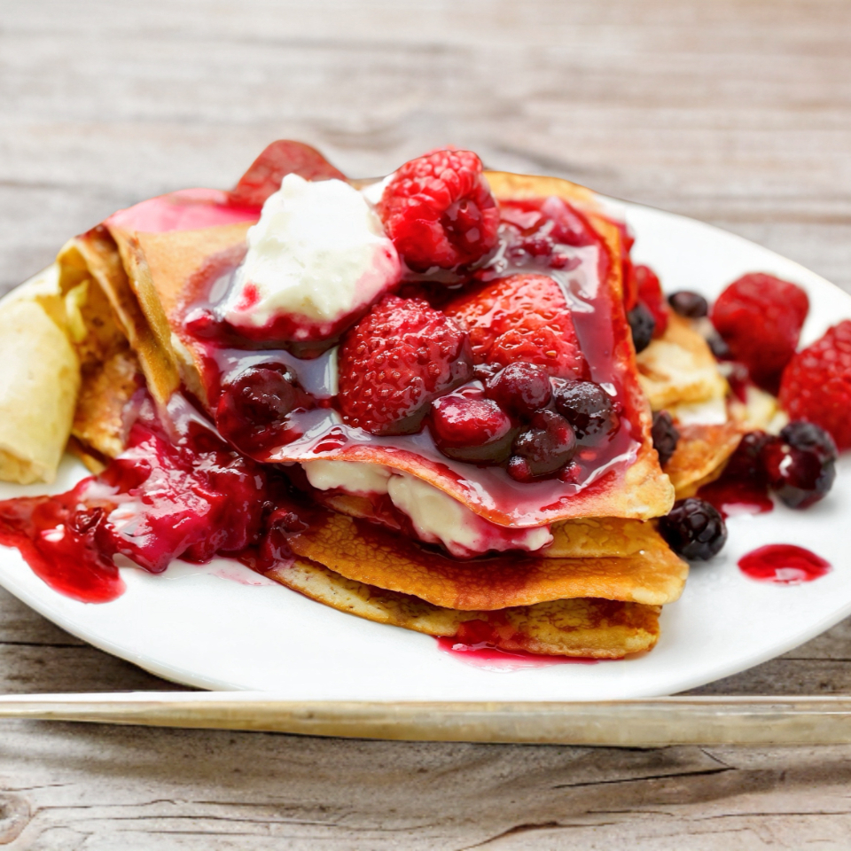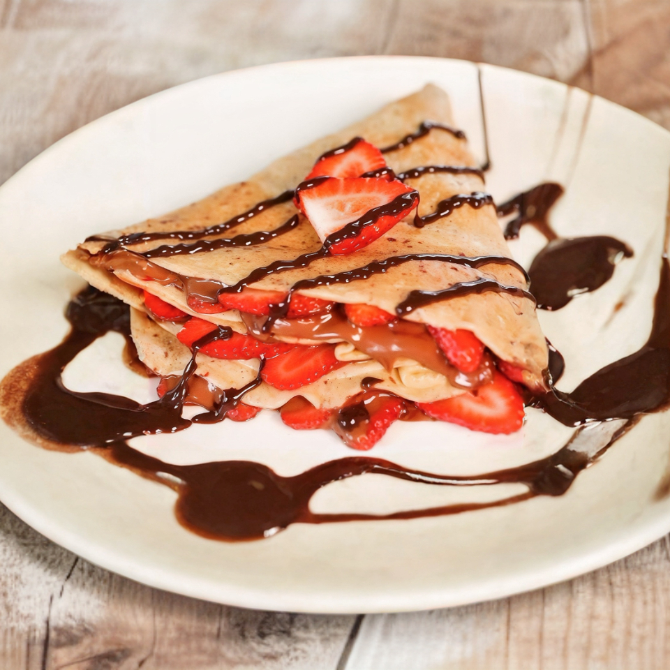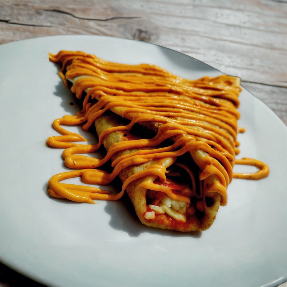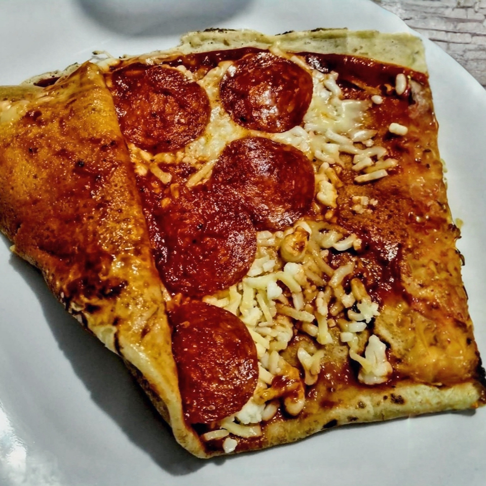 Deliciosa crepa de peperoni, jamon, tocino, salsa de tomate y queso manchego