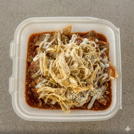 Bolillo con cama de frijoles, 40 grs de totopos fritos bañados en 150ml. de salsa a tu gusto. Elige tu proteína preferida, Acompañada con crema, queso y cebolla.