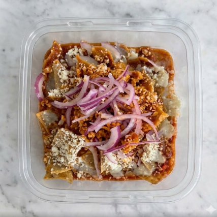 Chilaquiles GRANDES 1 pza de huevo, 80 Grs de Totopo dorado acompañado de 225 Mililitros de salsa a tu gusto, acompañados de Crema, Queso y Cebolla.