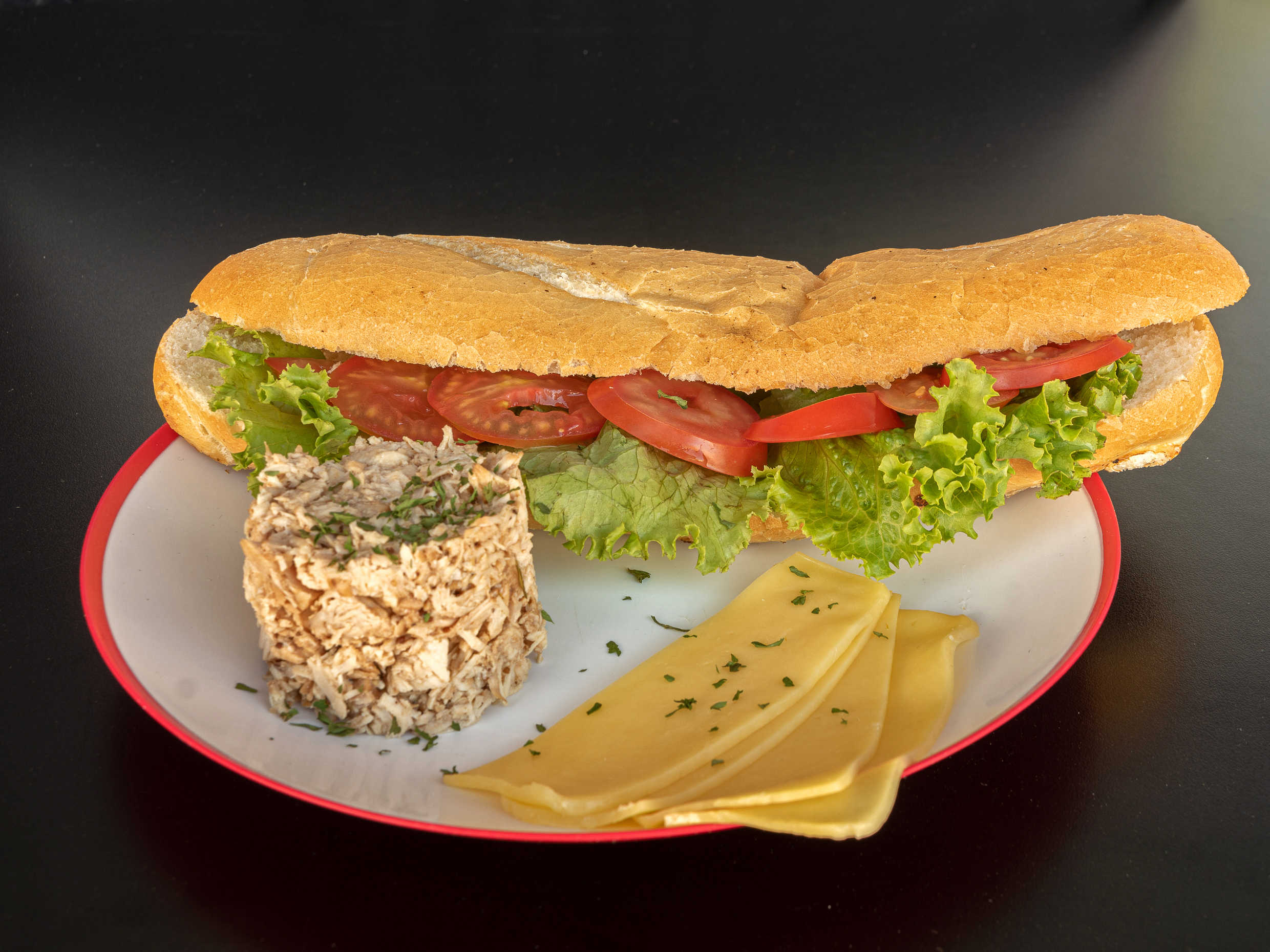 Jamón de pavo y queso gouda con lechuga y jitomate.