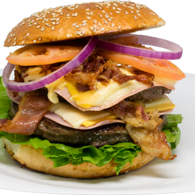 Hamburguesa con doble jamon, doble queso, doble tocino y vegetales