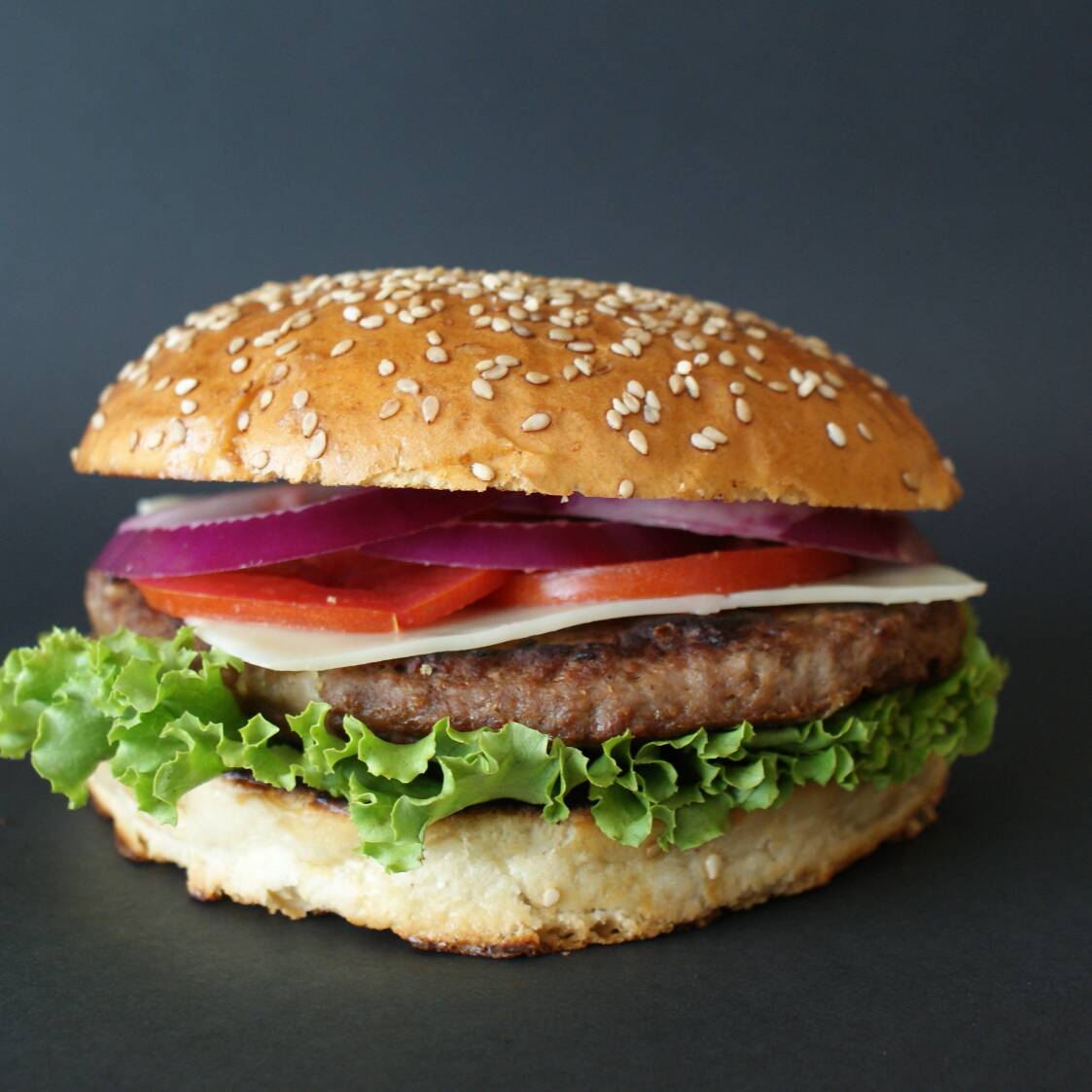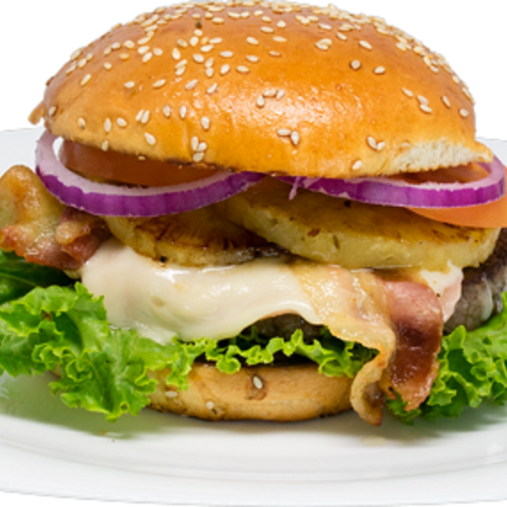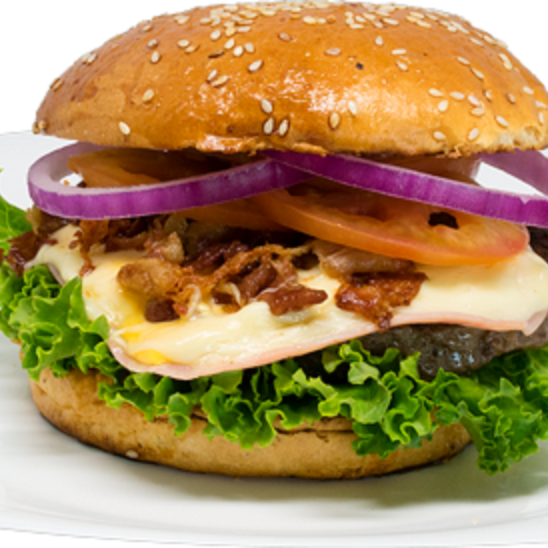 Hamburguesa con queso americano, queso gouda, tocino, jamon y vegetales