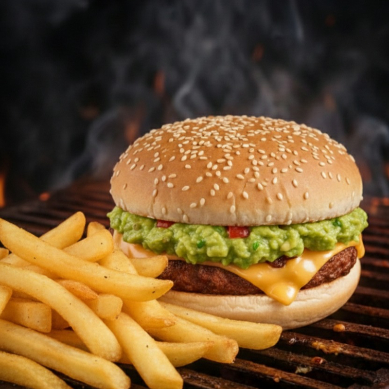 Carne de Res, Tocino, Guacamole picante, Queso Amarillo, Cebolla Caramelizada, Salsa de la casa, Jitomate, Aguacate, Mayonesa, Mostaza, Cátsup