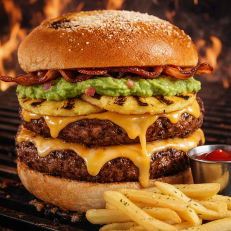 Doble porcion de Carne de Res, Doble porcion de Queso Amarillo, Una porción de Tocino, Cebolla Caramelizada, Una porción de Piña, Una porción de Guacamole Picosito, Salsa de la Casa, Jitomate, Mayonesa, Mostaza, Catsup.