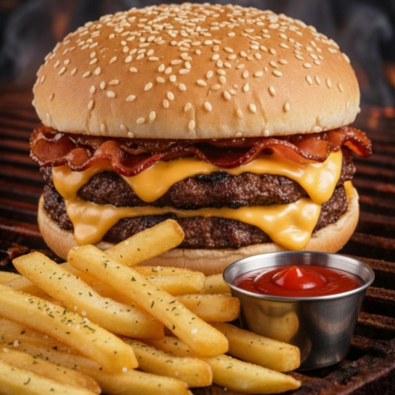 Doble Carne de Res, Doble Tocino, Doble Queso Amarillo, Cebolla Caramelizada, Salsa de la casa, Jitomate, Aguacate, Mayonesa, Mostaza, Cátsup