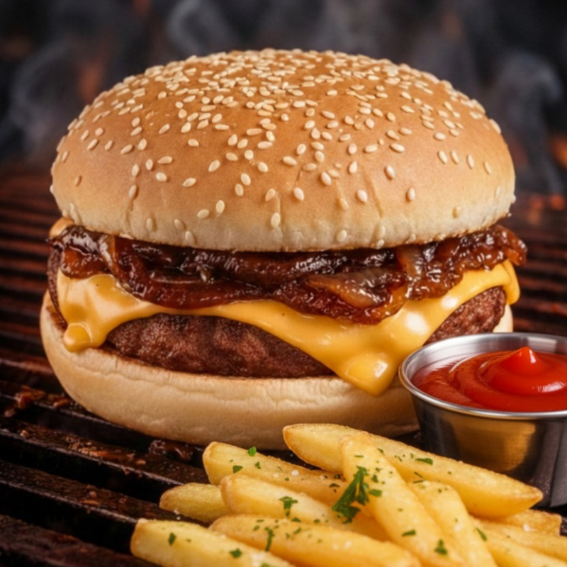 Carne de Res, Queso Amarillo, Cebolla Caramelizada, Salsa de la casa, Jitomate, Aguacate, Mayonesa, Mostaza, Cátsup