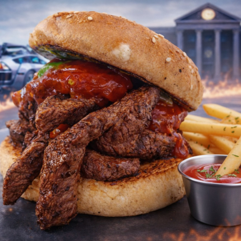 Carne de Arrachera Marinada, Cebolla Caramelizada, Aguacate, Jitomate, Salsa de la Casa, Mayonesa, Mostaza, Cátsup