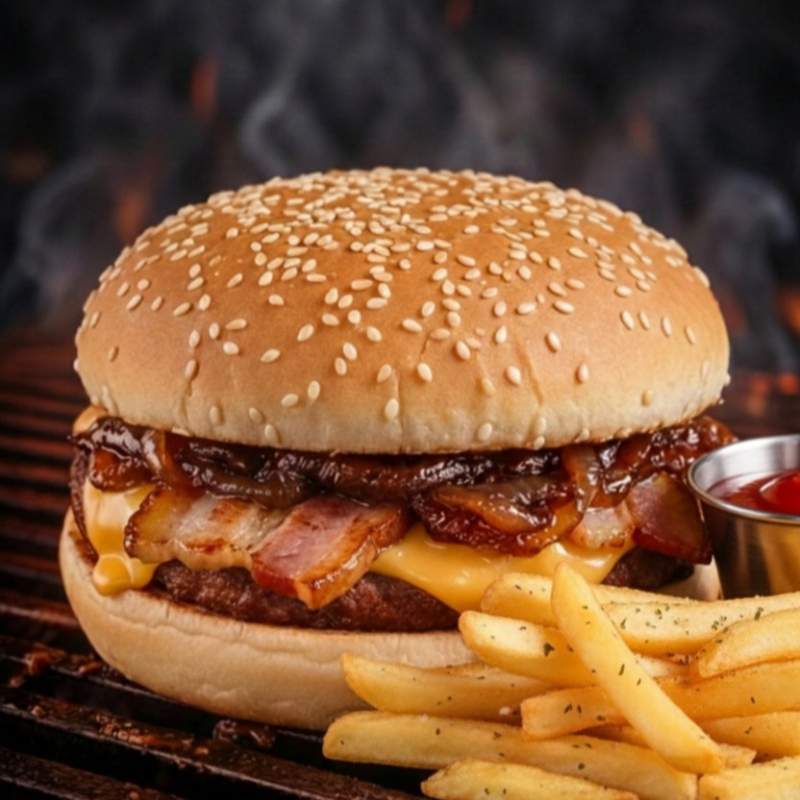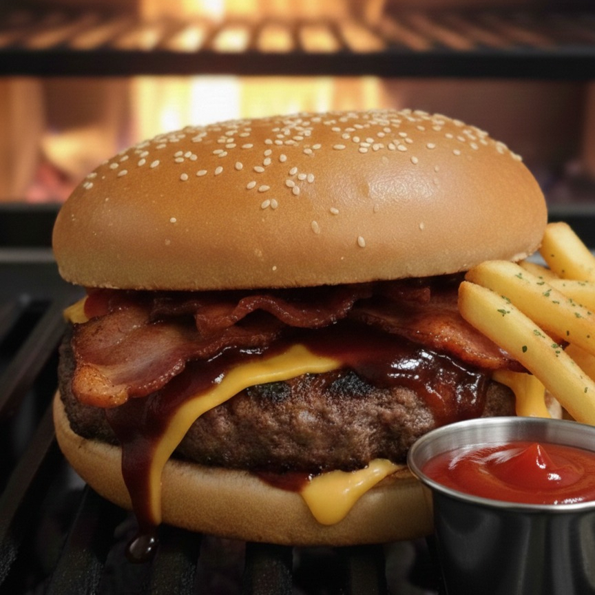 Carne de Res, Tocino, Salsa BBQ, Queso Amarillo, Cebolla Caramelizada, Salsa de la casa, Jitomate, Aguacate, Mayonesa, Mostaza, Cátsup