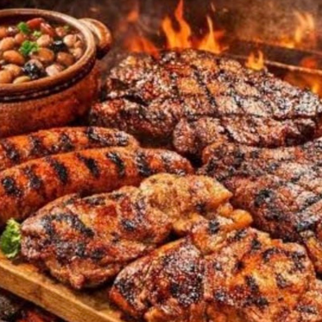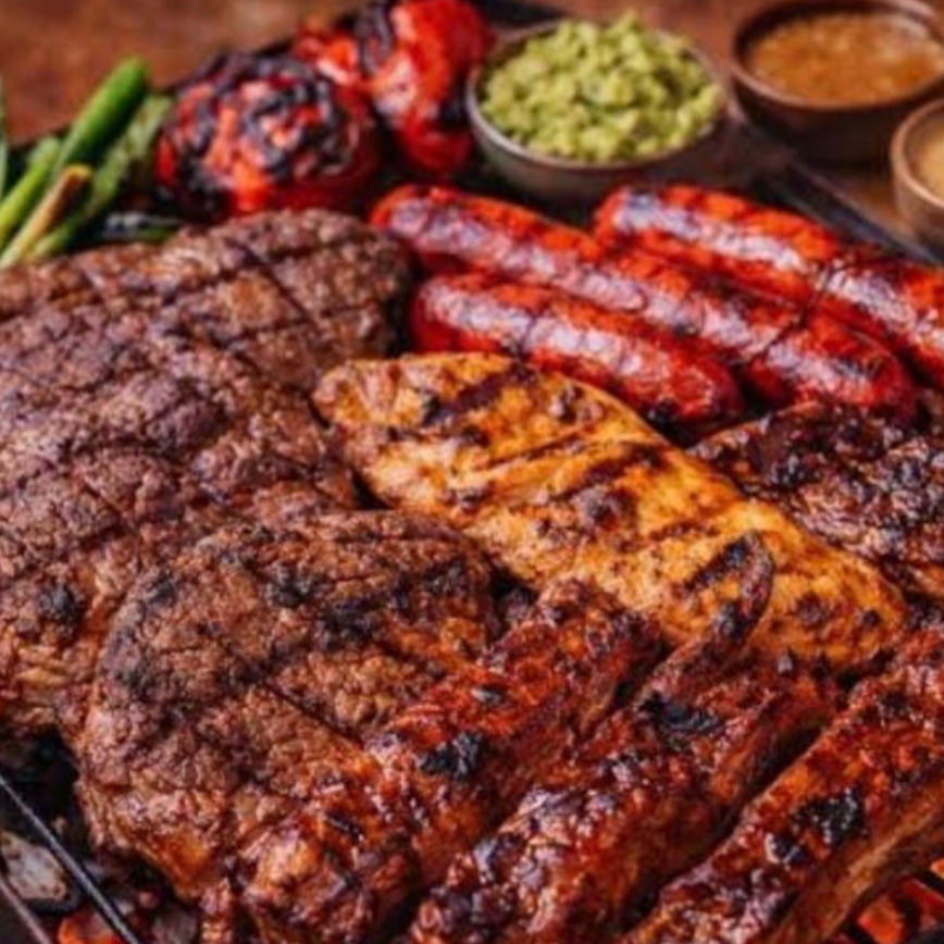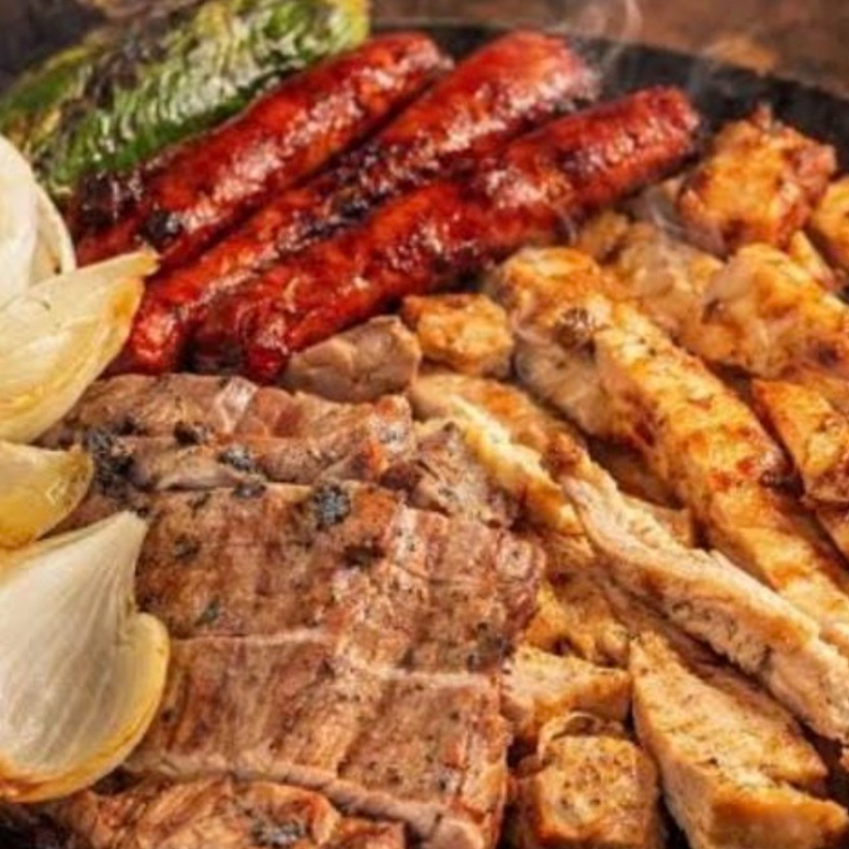 1kg de asada mixta (aguja, res, cerdo y pollo), frijoles charros, chorizo argentino, 2 salchichones, tortillas a mano, cebollitas y nopales, salsas.